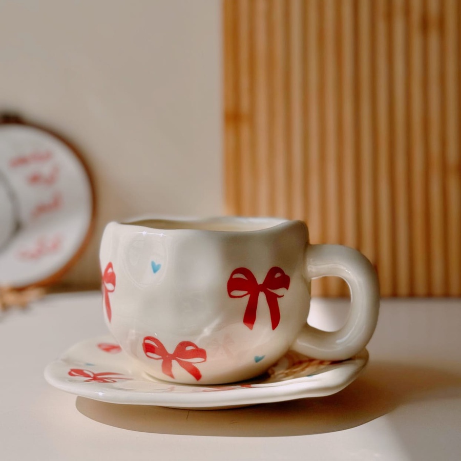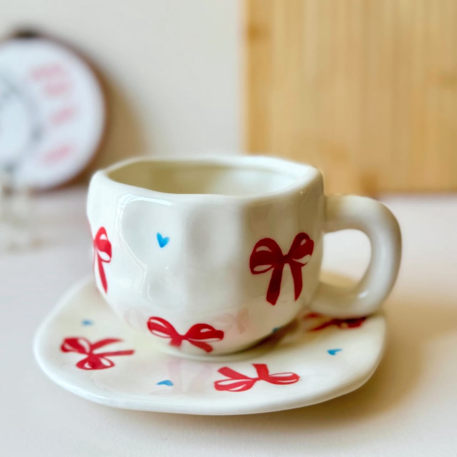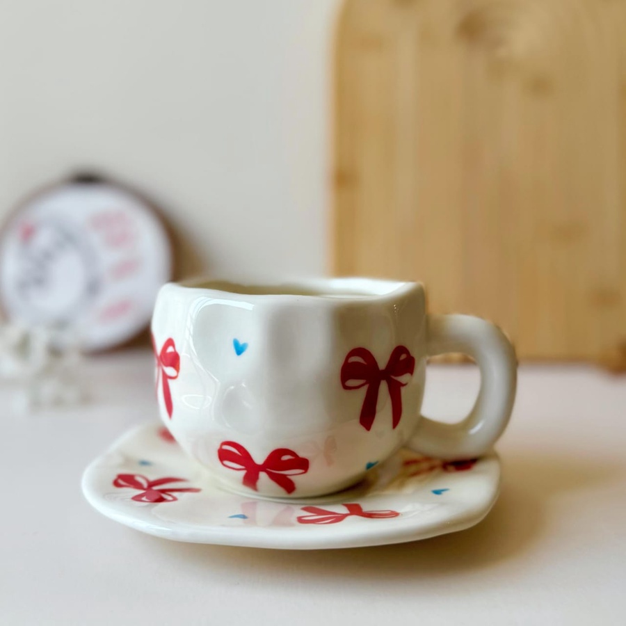 فنجان يزينه فيونكات حمراء رقيقة كإنه قطعة هدية صغيرة مع قلوب صغيرة هيضيف لمسة من البهجة والنعومة ليومك