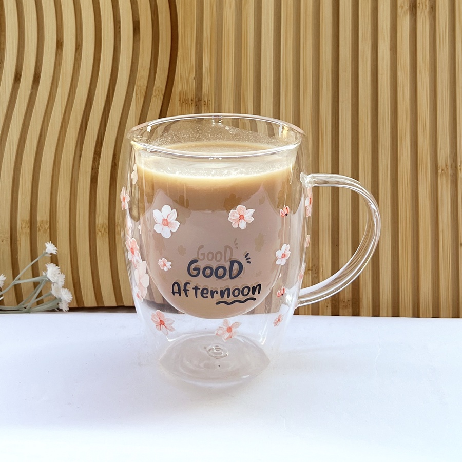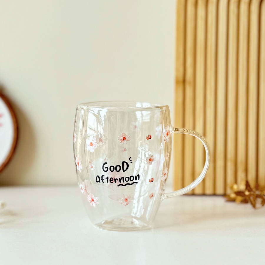 مج دبل جلاس مكتوب عليه جملة good afternoon ومرسوم عليه ورد بينك هيبقى بداية مشرقة ليومك