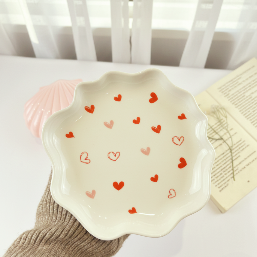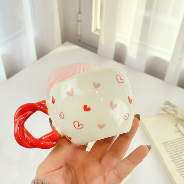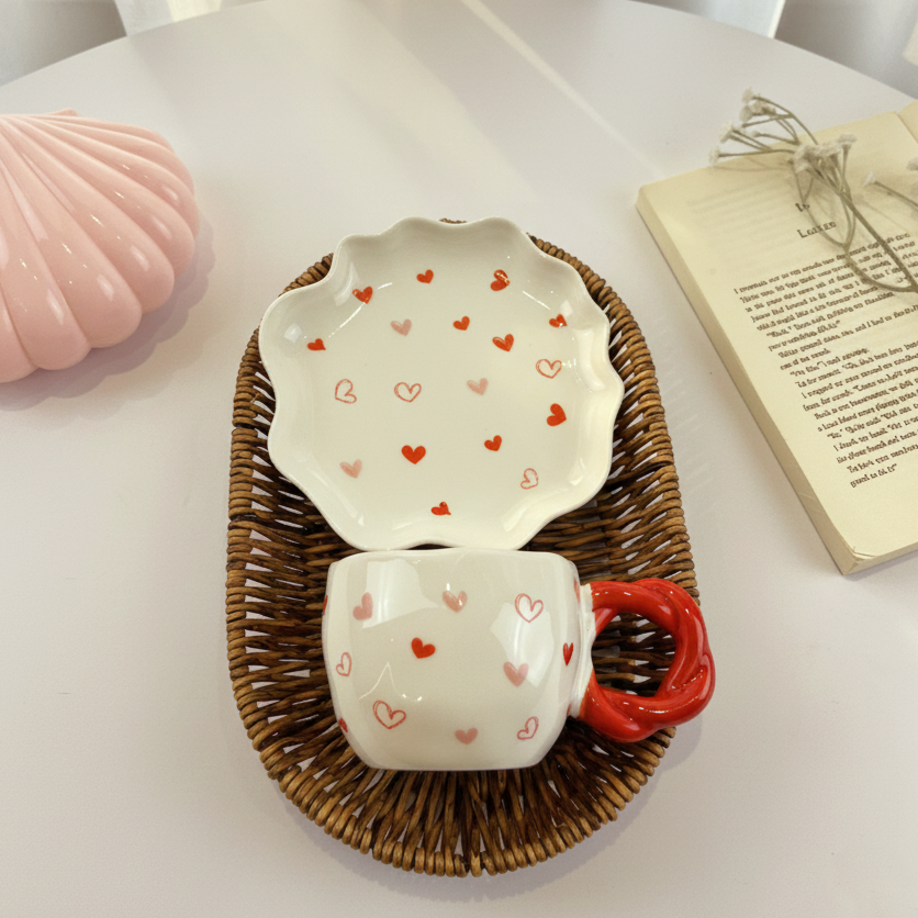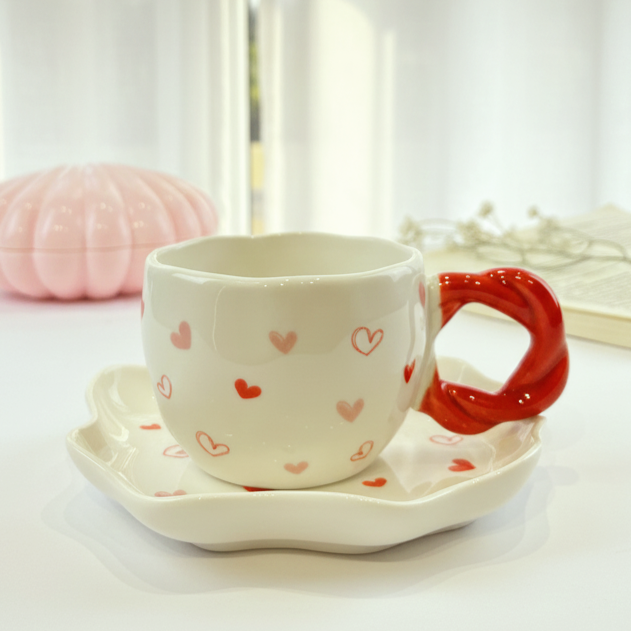 فنجان عليه قلوب ملونة وشكل إيده مميز معاه طبق يمكن استخدامه ك كوستر