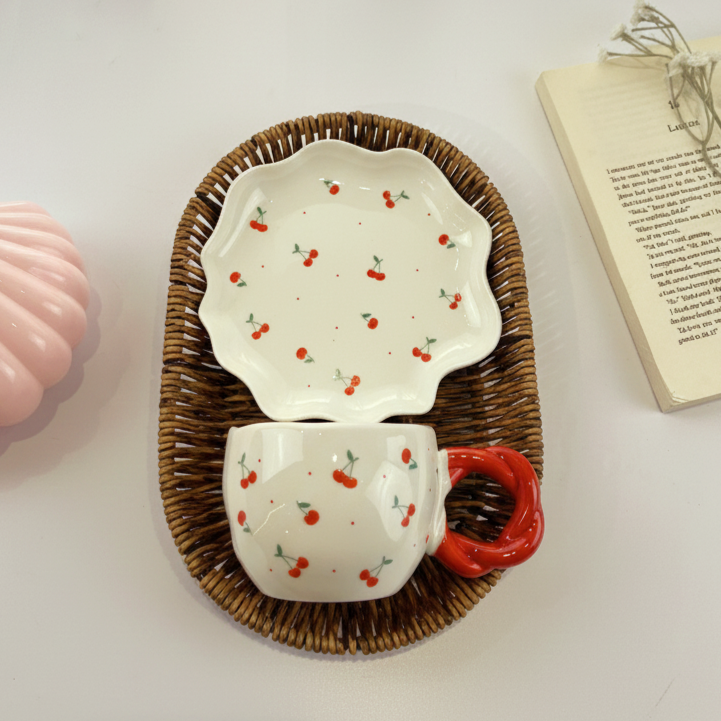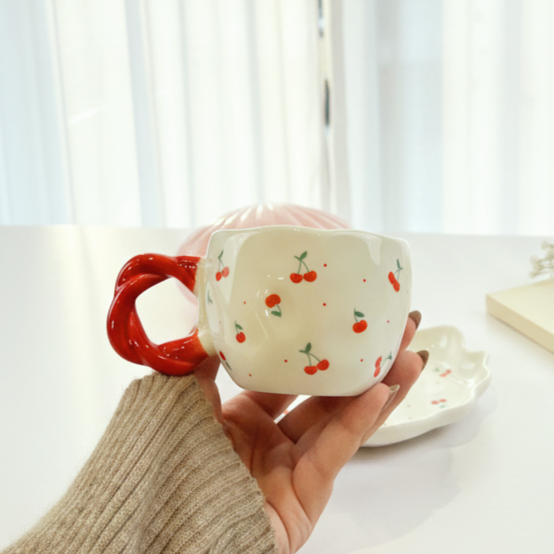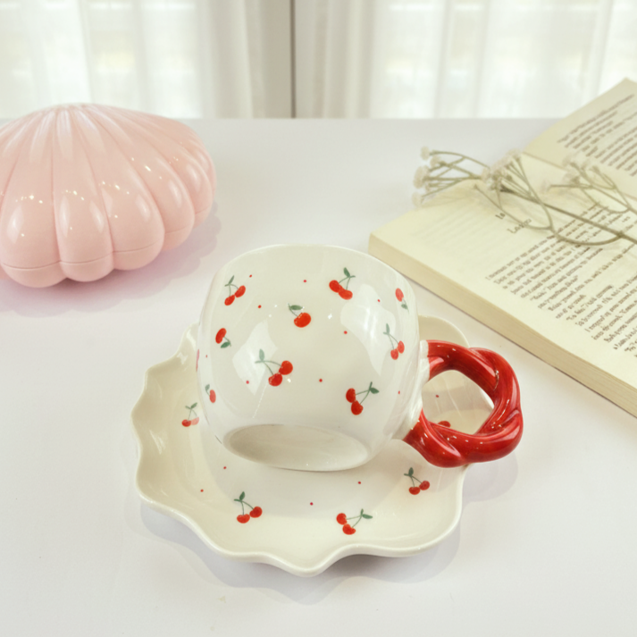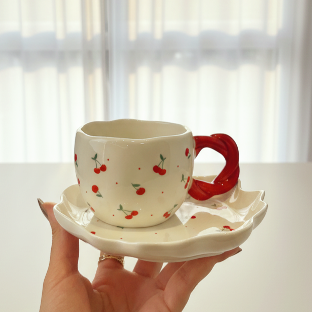 فنجان عليه رسومات كريز باللون الأحمر وشكل إيده مميز معاه طبق يمكن استخدامه ك كوستر