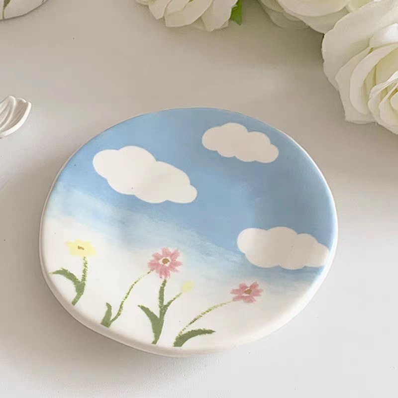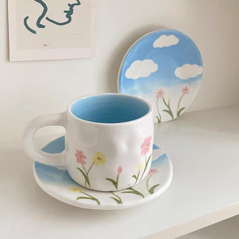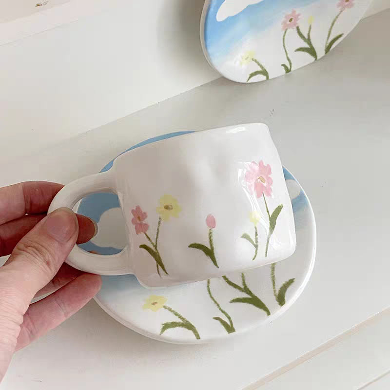 فنجان أنيق برسومات لطيفة كإنه لوحة فنية الفنجان عليه ورد لطيف بنفس لون الطبق هيبقى بداية مبهجة ليومك