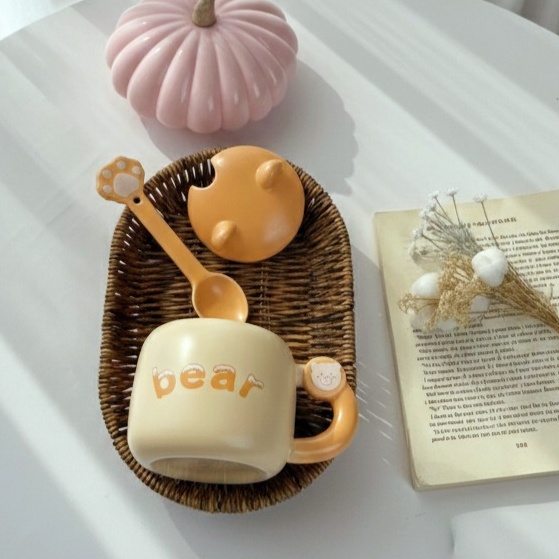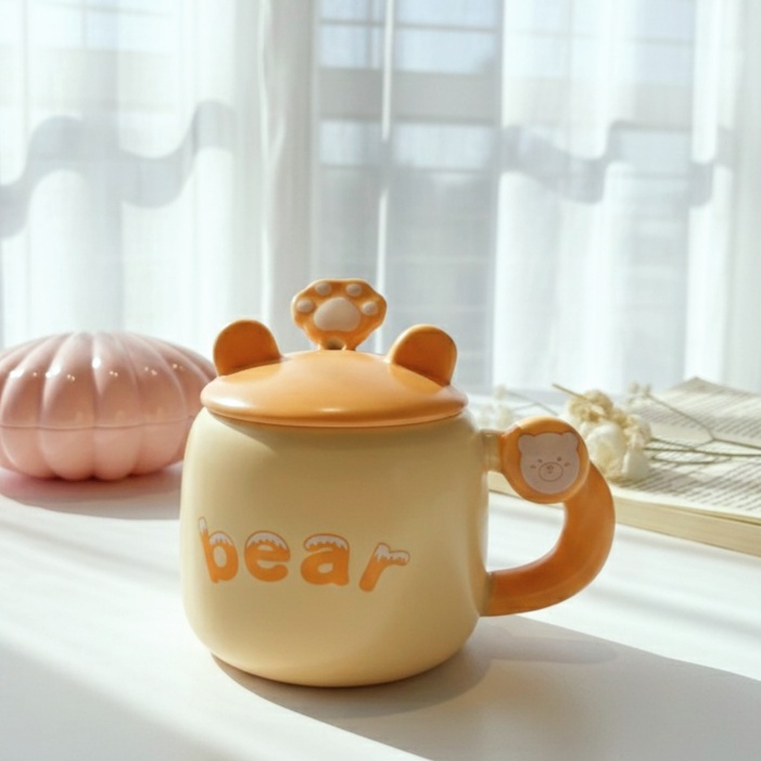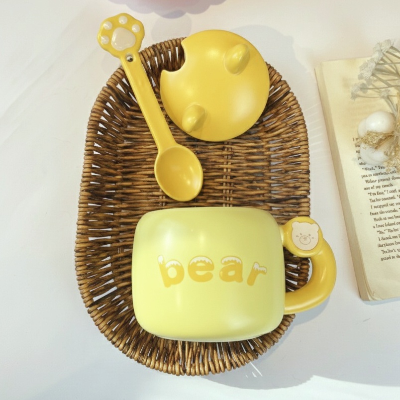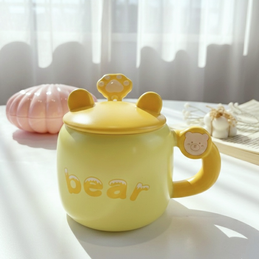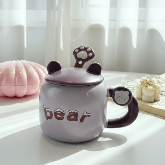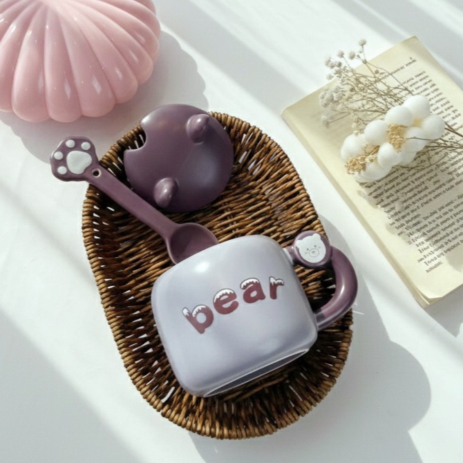 مج كيوت على شكل دب بألوان مبهجة ومعاه معلقة بنفس الشكل