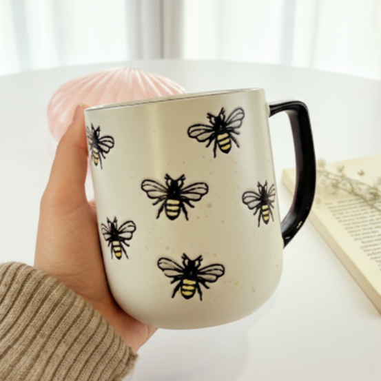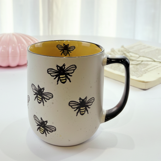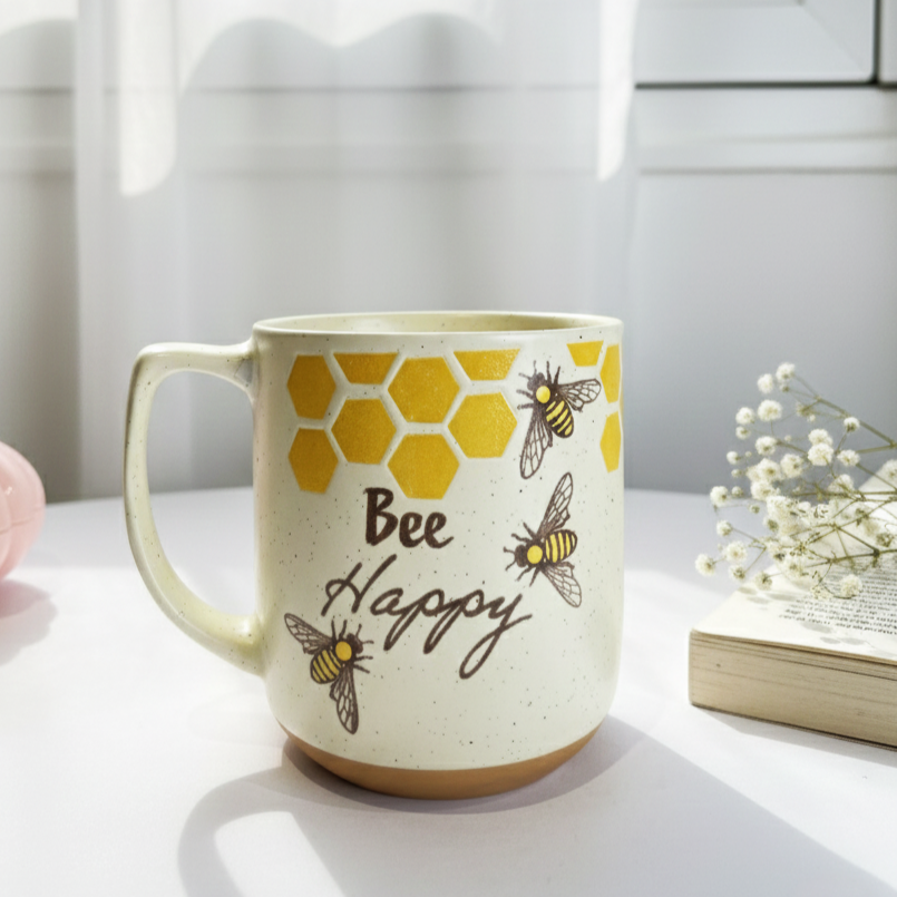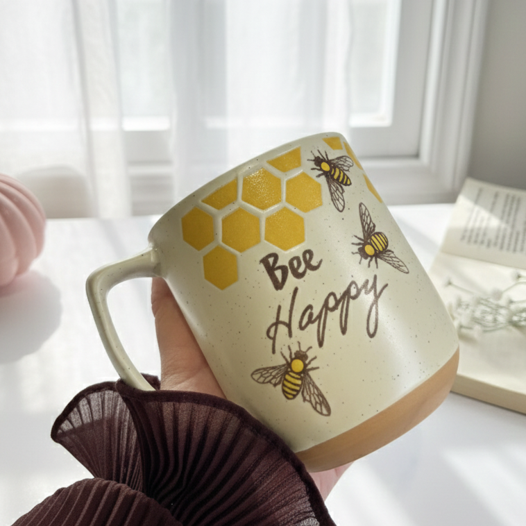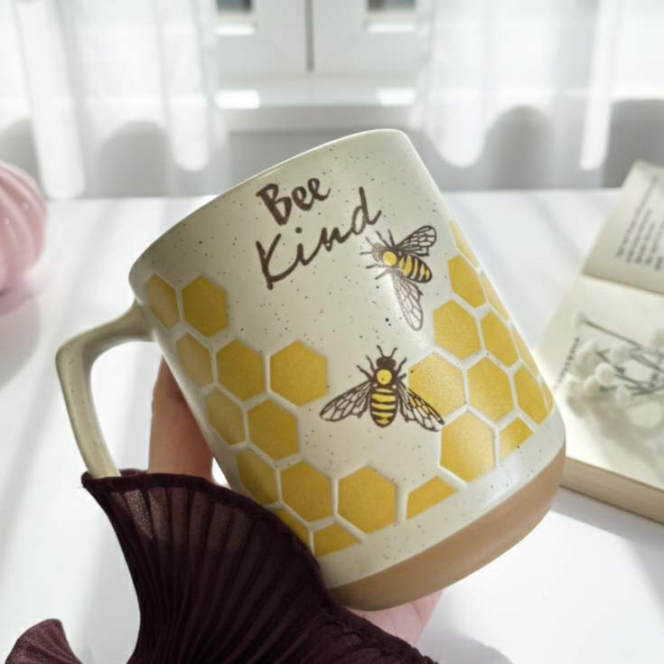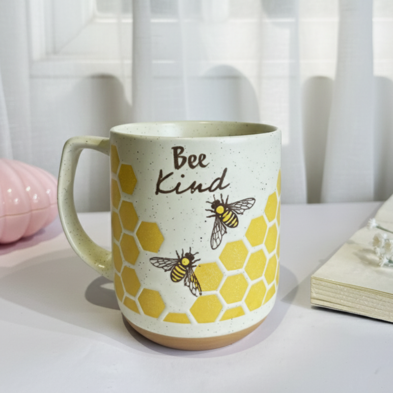 مج عليه رسومات نحل وخلية العسل ومكتوب عليه quotes لطيفة