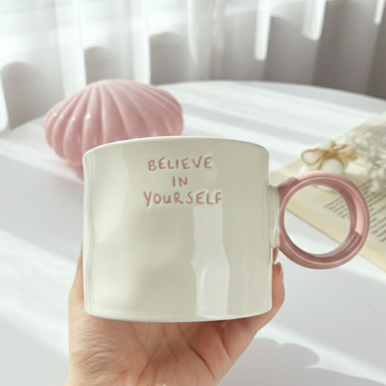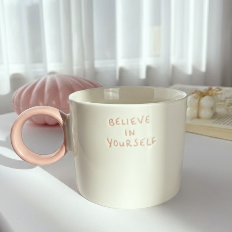مج لامع بيد مدورة مميزة مكتوب عليه believe in your self عشان يبقى هدية مميزة
