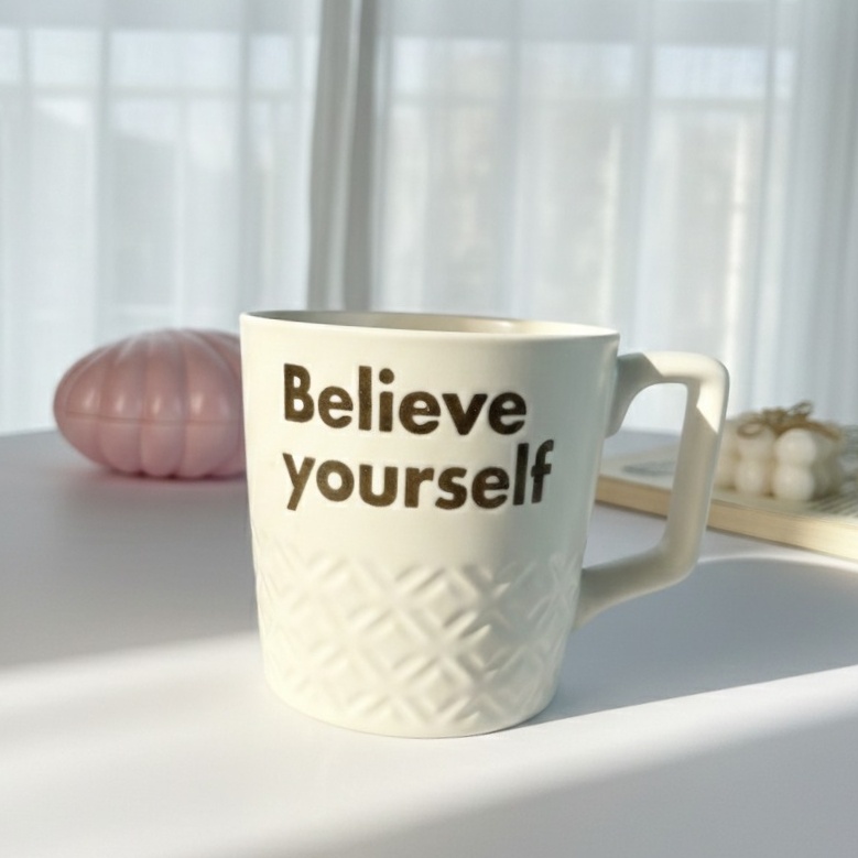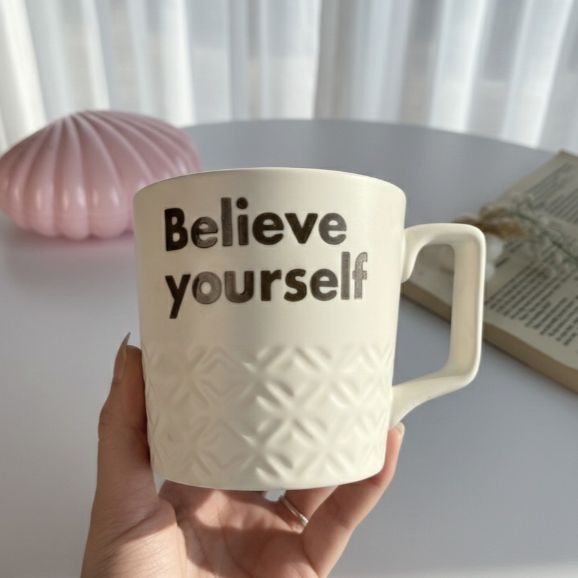 مج بلون مطفي ناعم مكتوب عليه جملة believe yourself ورسومات بارزة بشكل مميز