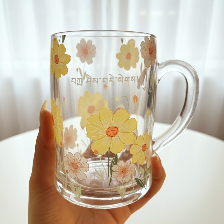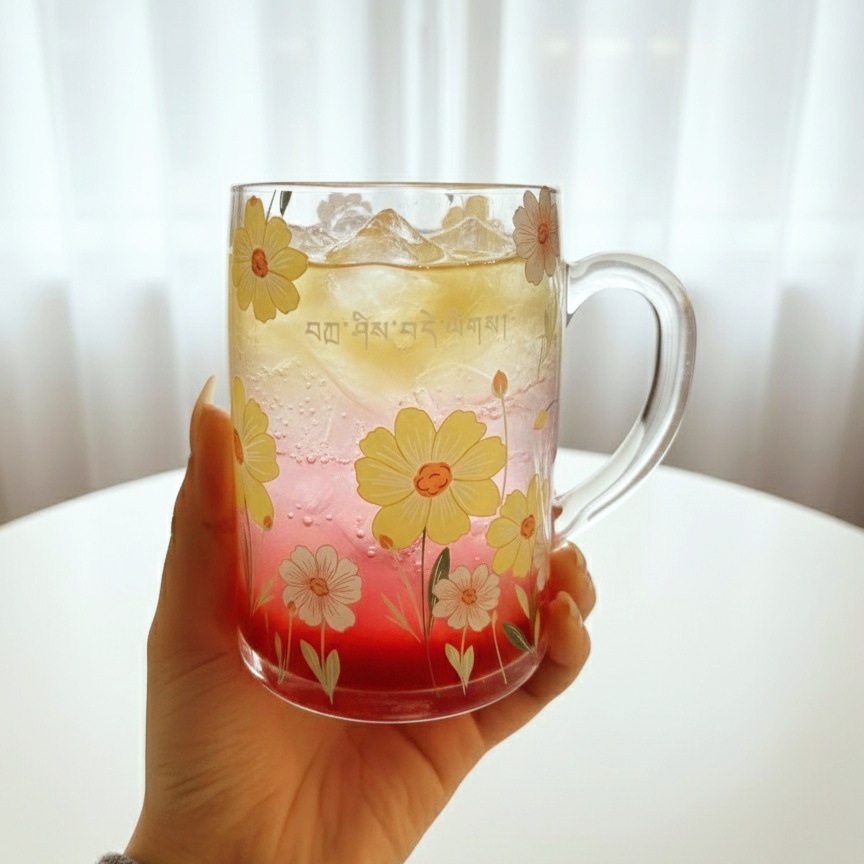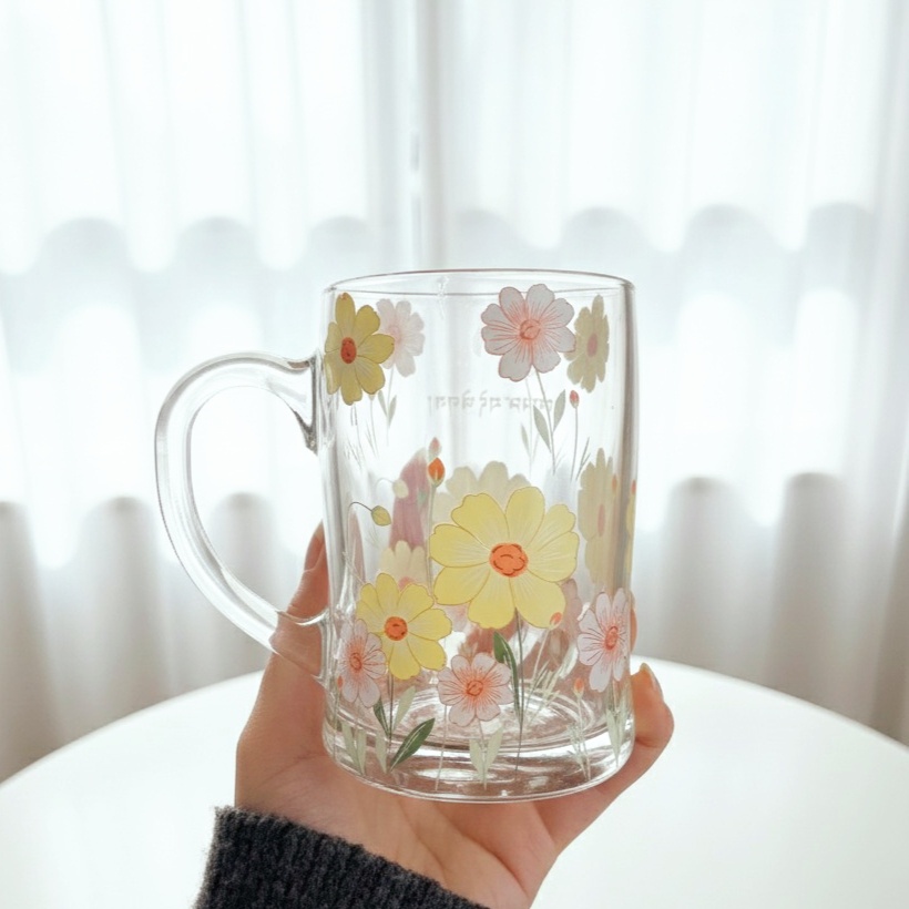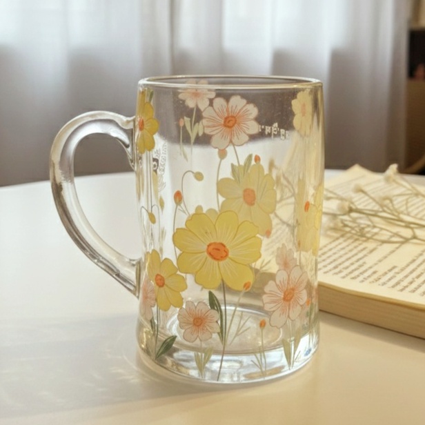 مج زجاج عليه نقوشات ورد لطيف عشان يبقى بداية جميلة ليومك