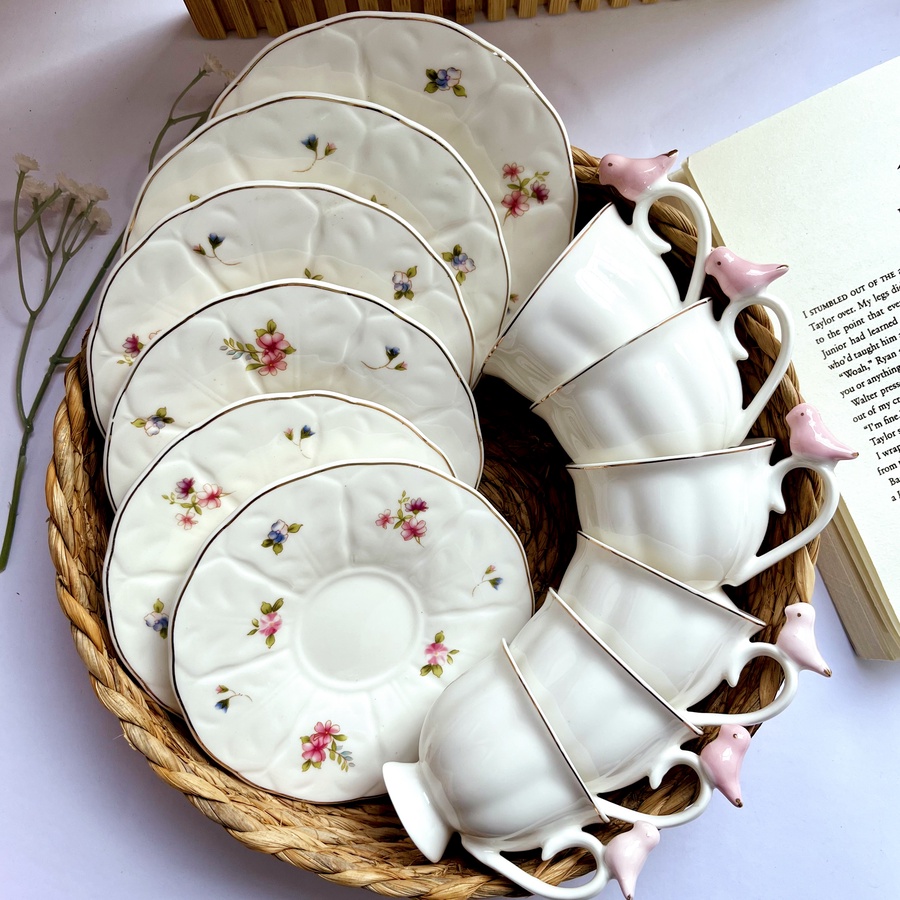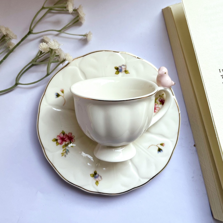 فنجان عليه عصفورة بارزة بشكل كيوت وطبق متزين بالورد مناسب لمشروبك المفضل سواء قهوة أو شاي
