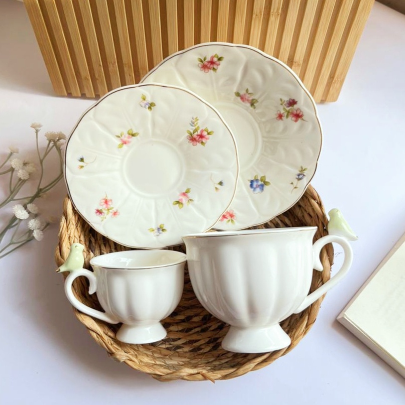 فنجان عليه عصفورة بارزة بشكل كيوت وطبق متزين بالورد مناسب لمشروبك المفضل سواء قهوة أو شاي