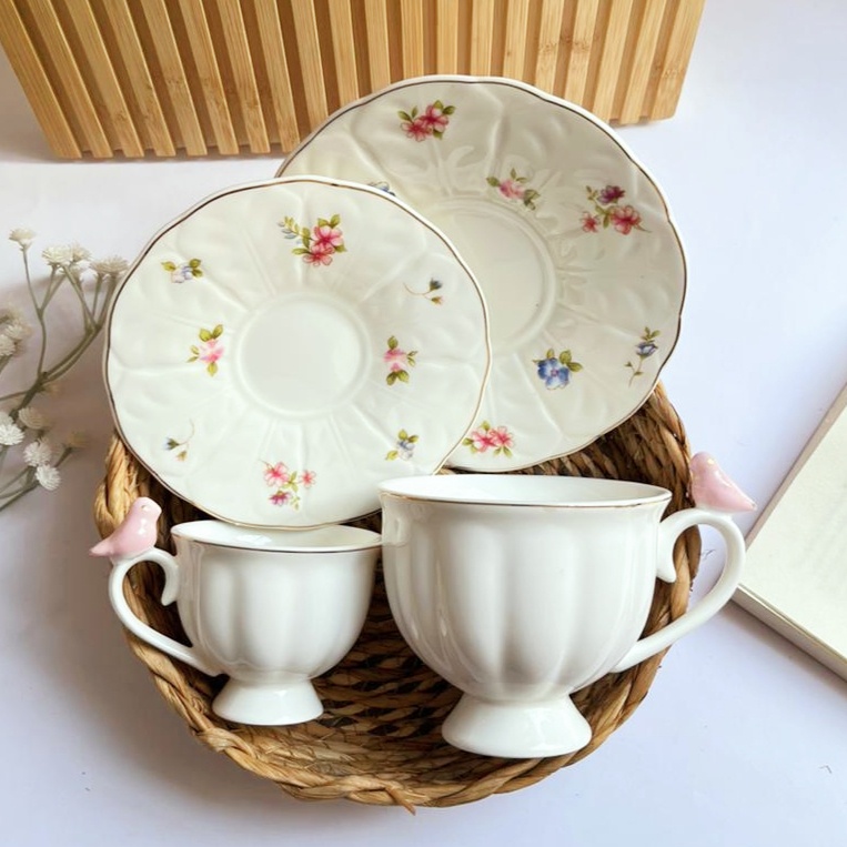 فنجان عليه عصفورة بارزة بشكل كيوت وطبق متزين بالورد مناسب لمشروبك المفضل سواء قهوة أو شاي
