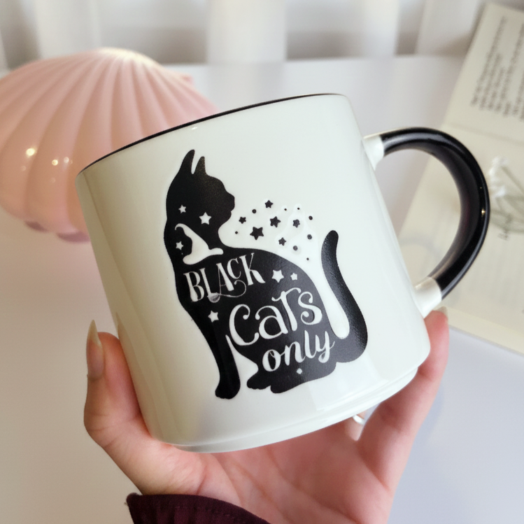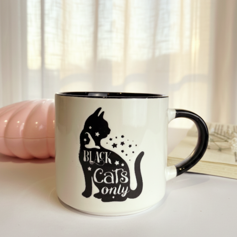 مج لطيف باللون الأبيض والأسود مرسوم عليه قطة ومكتوب جملة Black Cats Only هدية لطيفة ومميزة