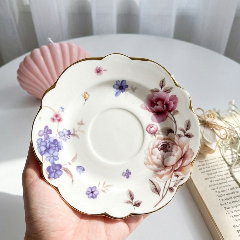 فنجان رقيق مزيّن بورود كل جنب برسمة مختلفة ف بيدي إحساس مختلف ومميز إيده جولد مع قاعدة بنفس اللون بتدي إحساس بالفخامة