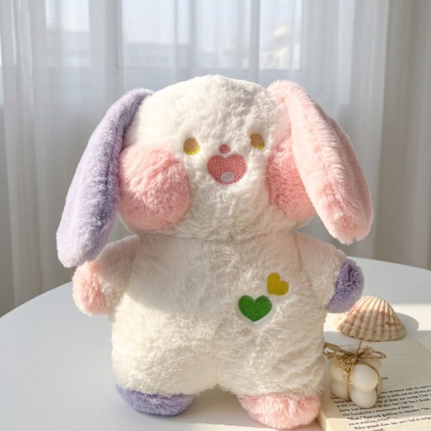 دبدوب أرنب صغير ملمسه ناعم زي الغيمة وألوانه باستيل هادية، ودانه طويلة وخدوده بينك