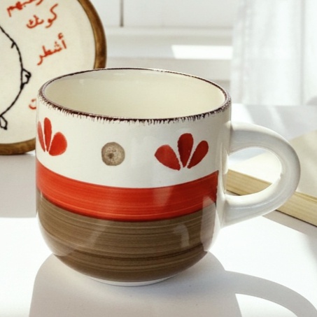 مج أنيق بيجمع بين اللون الأحمر والبني والأبيض بشكل كلاسيك ومميز لمحبي البساطة