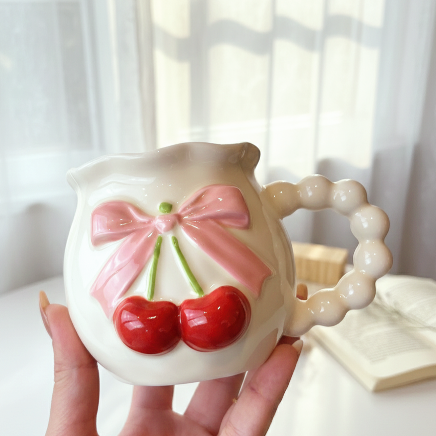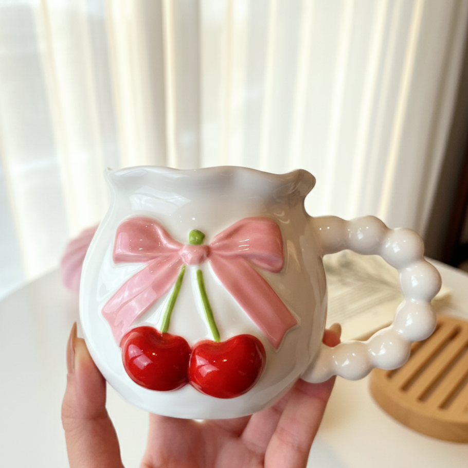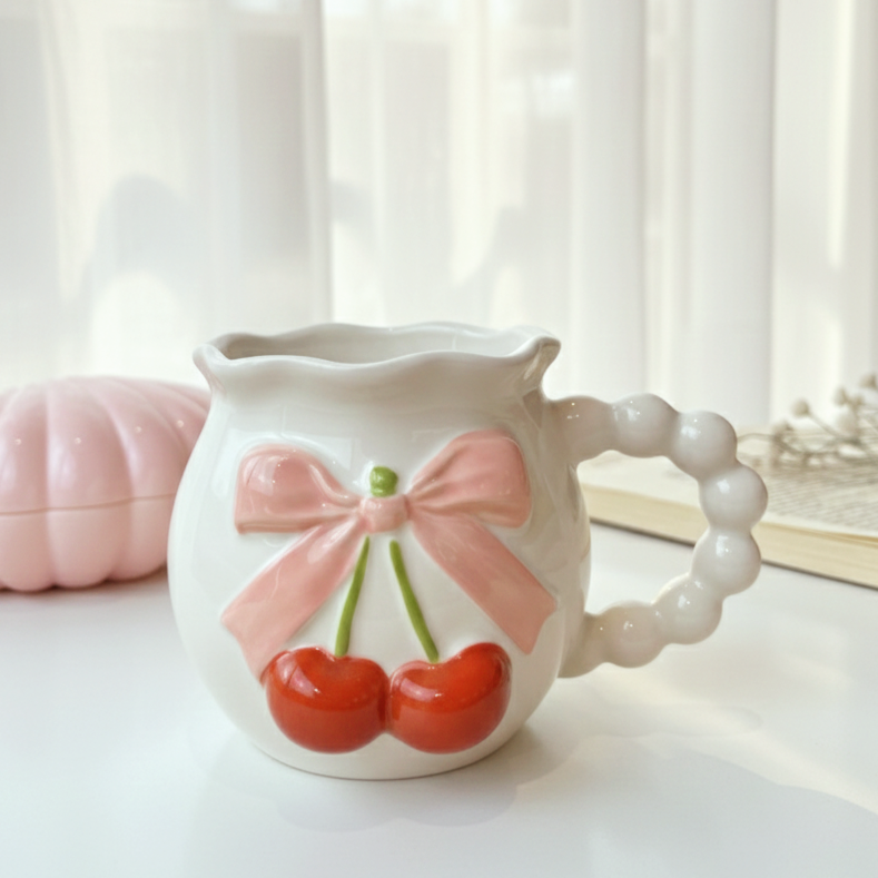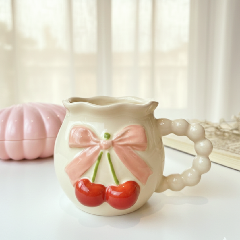 مج كيوت عليه رسمة فيونكة وكريز بارز شكله أنيق ورقيق