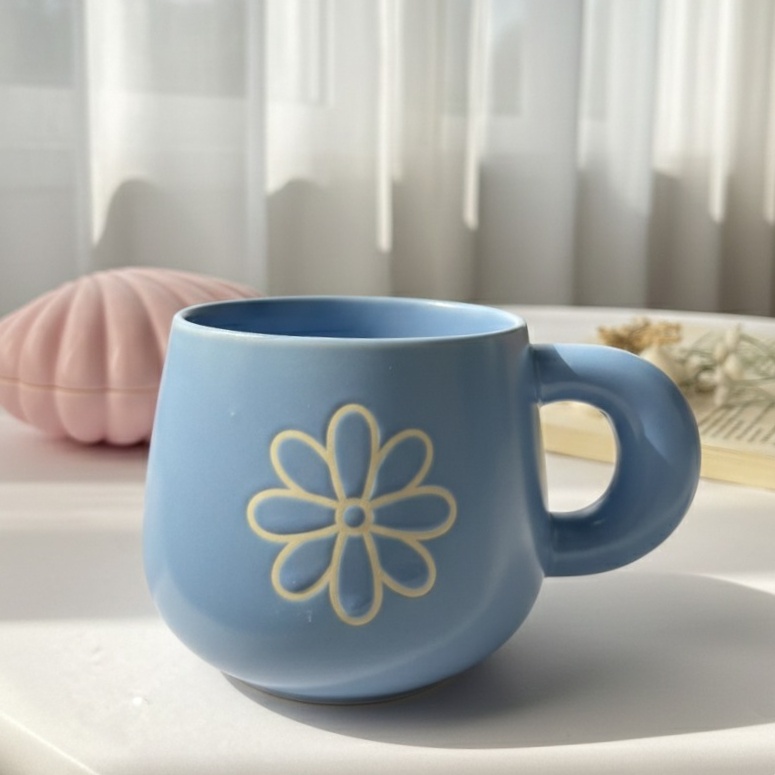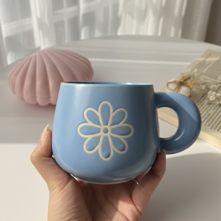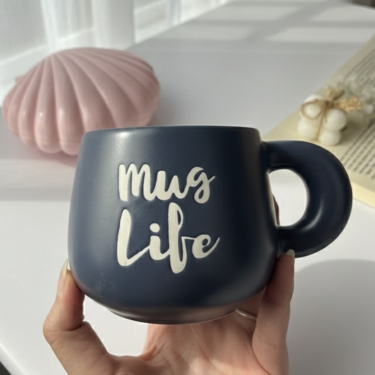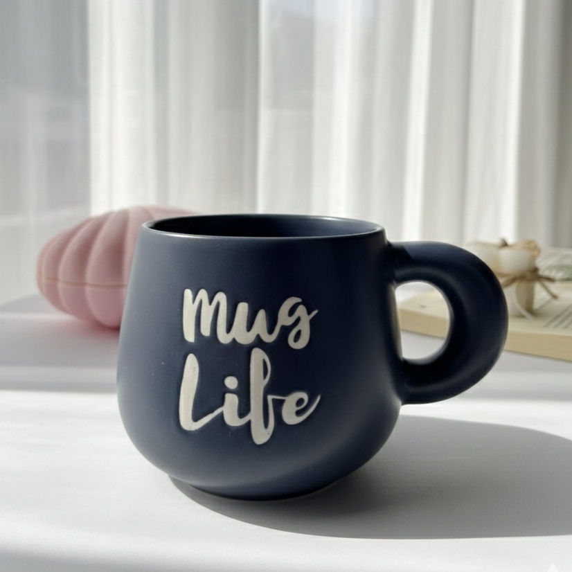 مج كلاسيك واحد باللون اللبني نرسوم عليه وردة رقيقة والتاني لونه كحلي مكتوب عليه mug life حجمه عملي مناسب للشاي والنيسكافيه