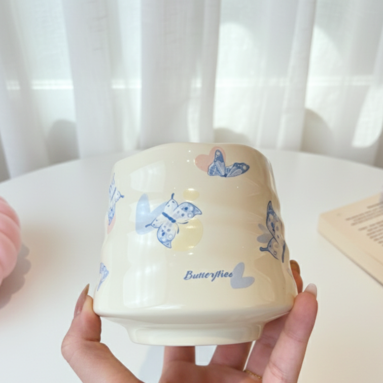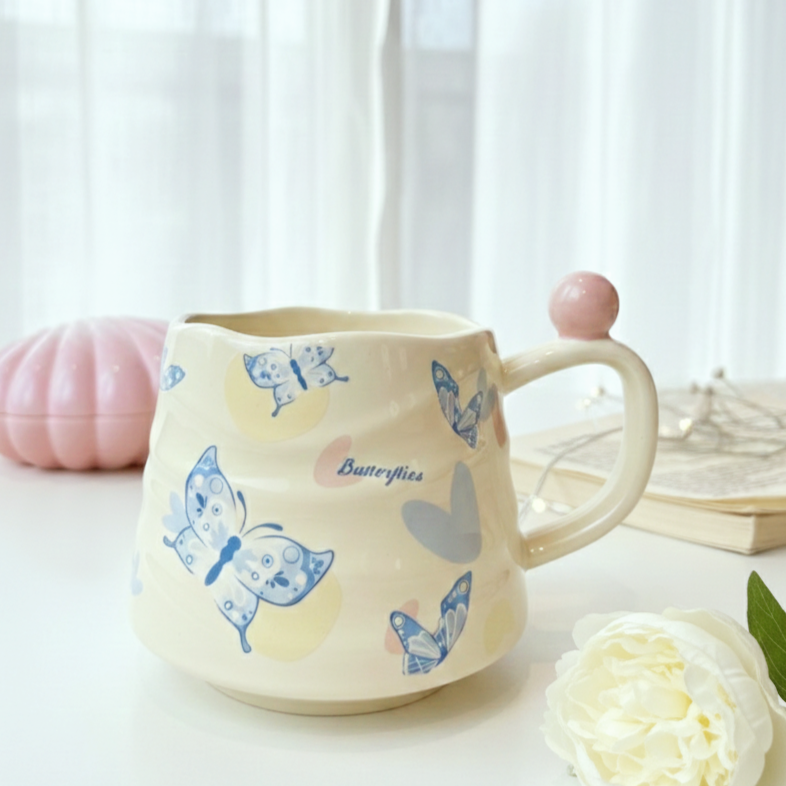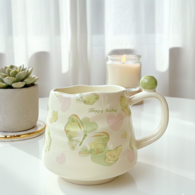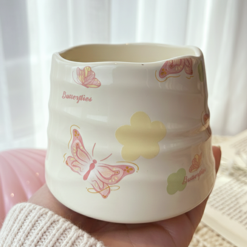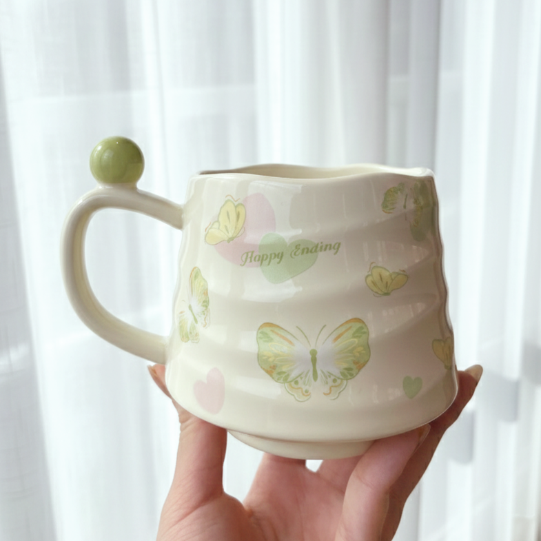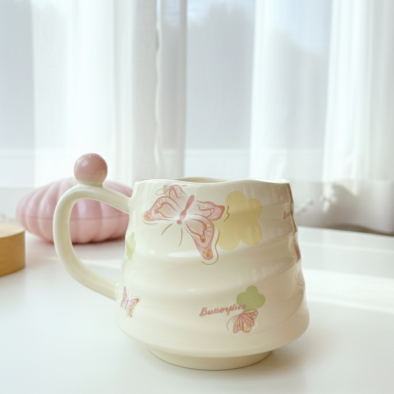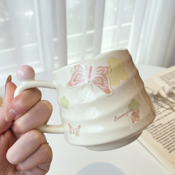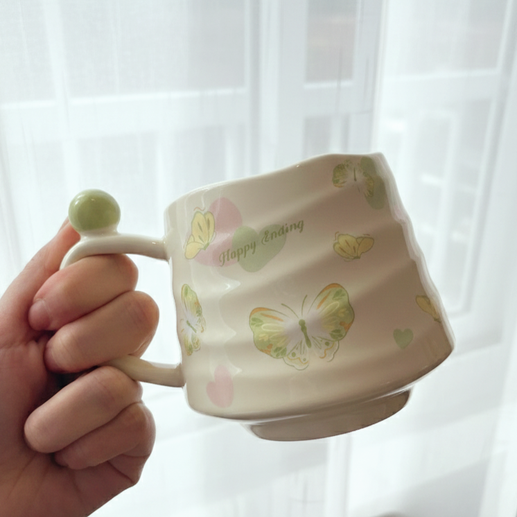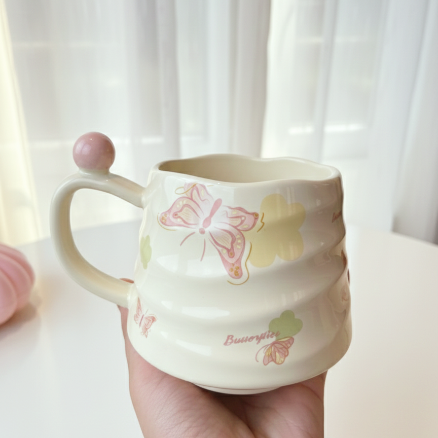 مج رقيق برسومات فراشة وورود بطول المج وشكل مموج هيبقى بداية مبهجة وجميلة ليومك