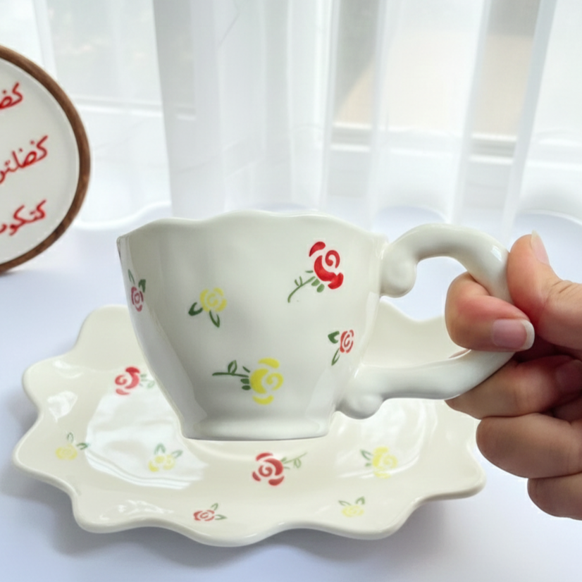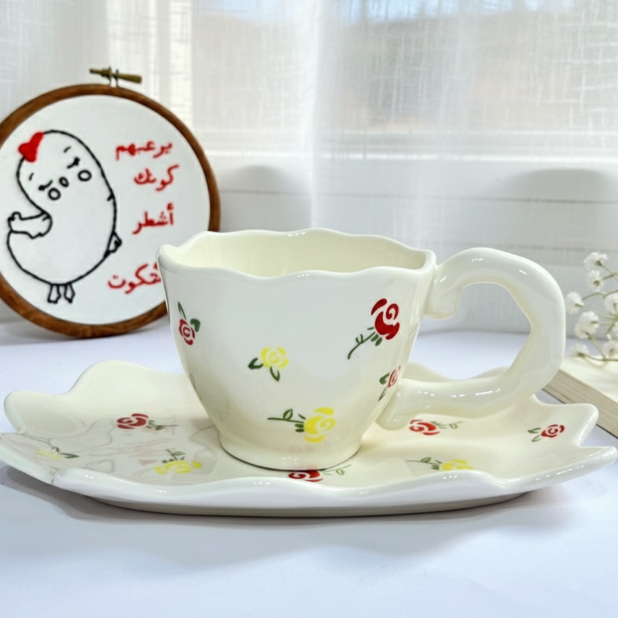 طقم فنجان وطبق بتصميم متموّج ولمسات من زهور صغيرة. بلون أحمر وأصفر ألوانه ناعمة وتفاصيله مبهجة هيديكي إحساس بالسعادة في كل مرة تستخدميه فيها 🌹🌼