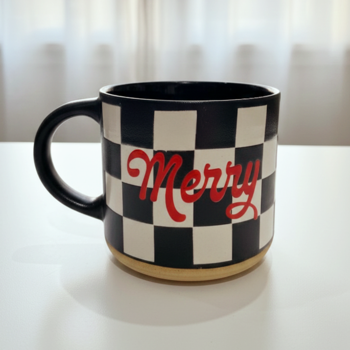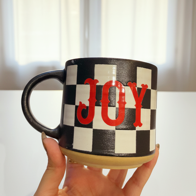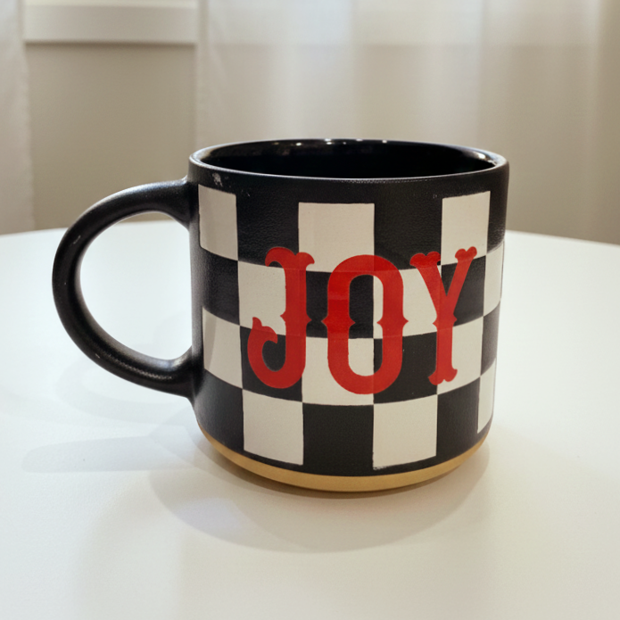 مج مرسوم عليه مربعات أبيض وأسود وعليه quote لطيفة شكله مميز وأنيق