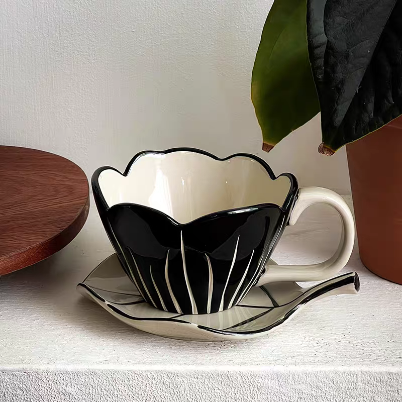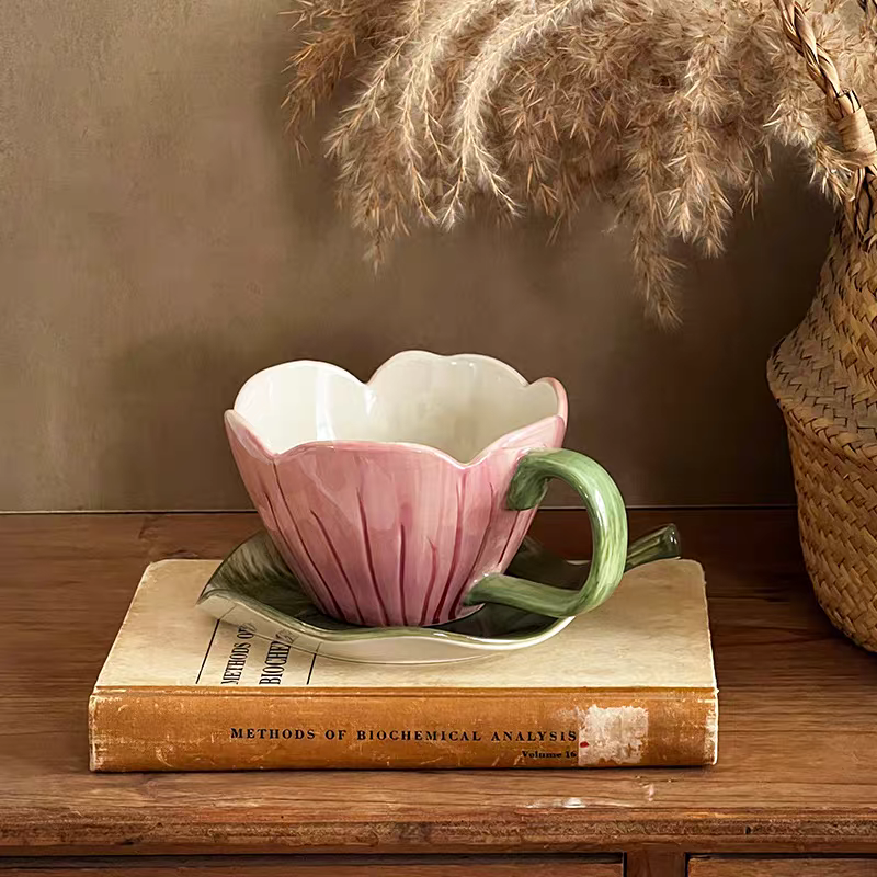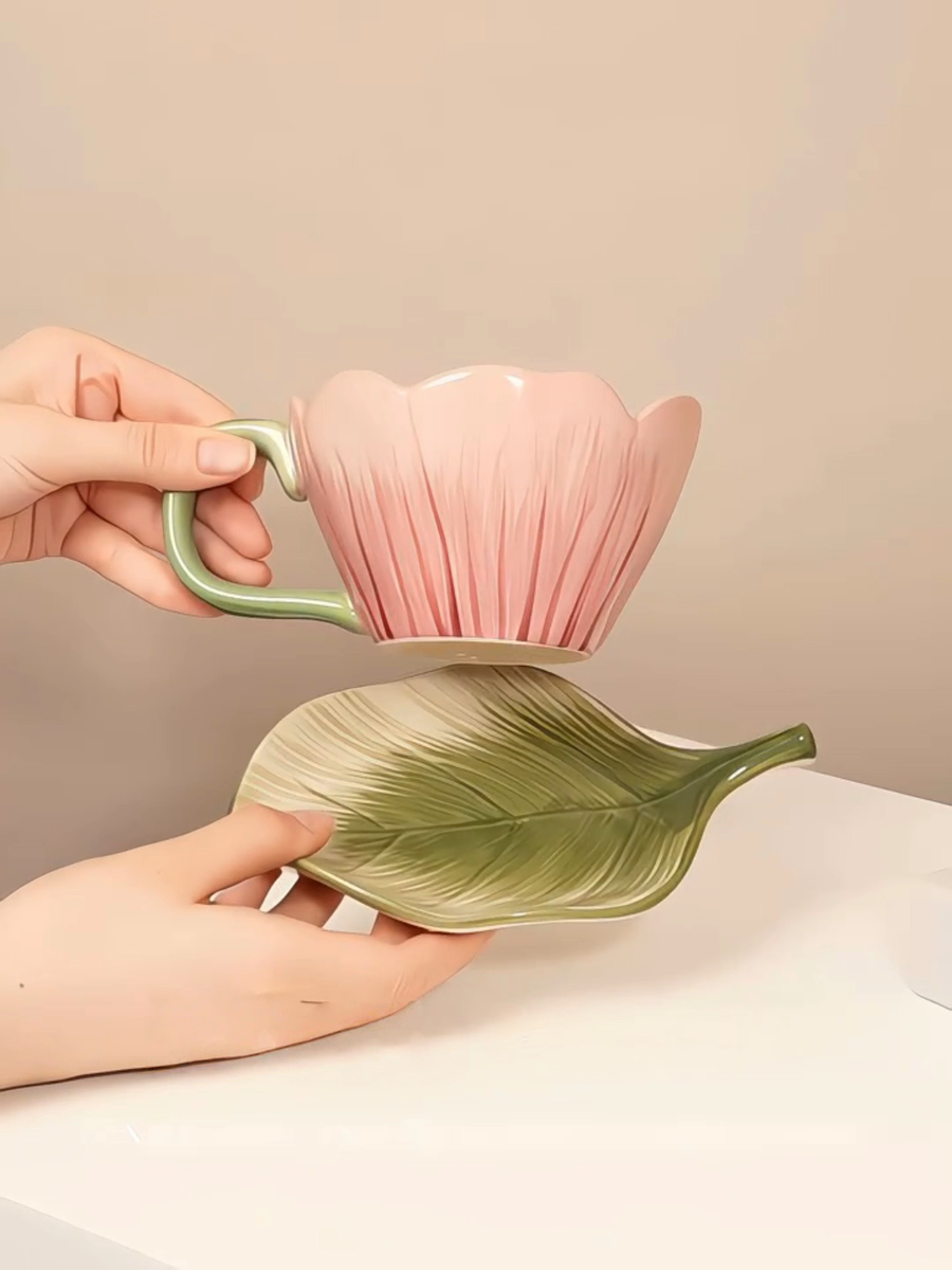 فنجان رقيق على شكل وردة والطبق على شكل ورقة شجر