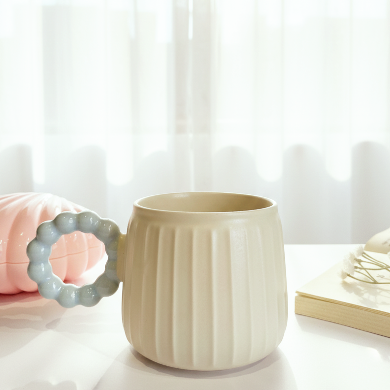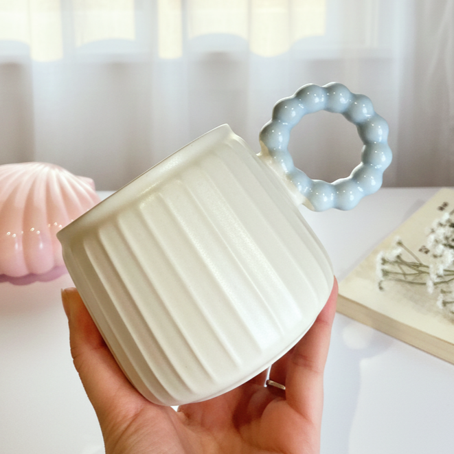 مج شكله أنيق بلون أوف وايت وإيده على شكل بابلز بلون لبني لمحبي البساطة