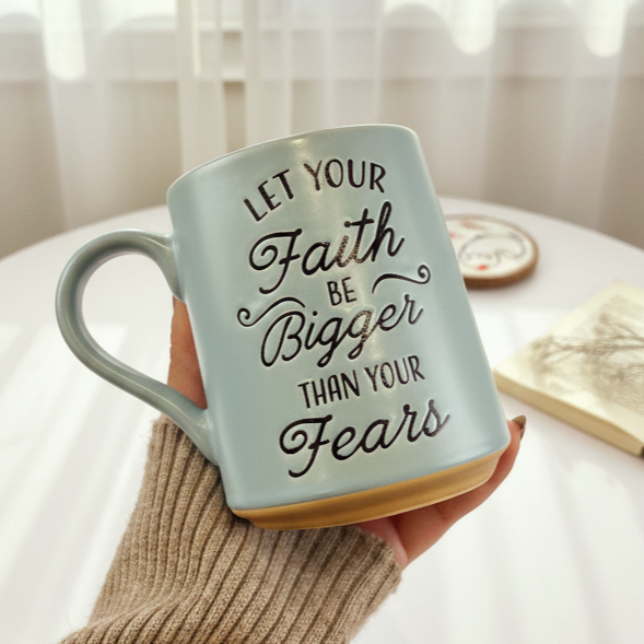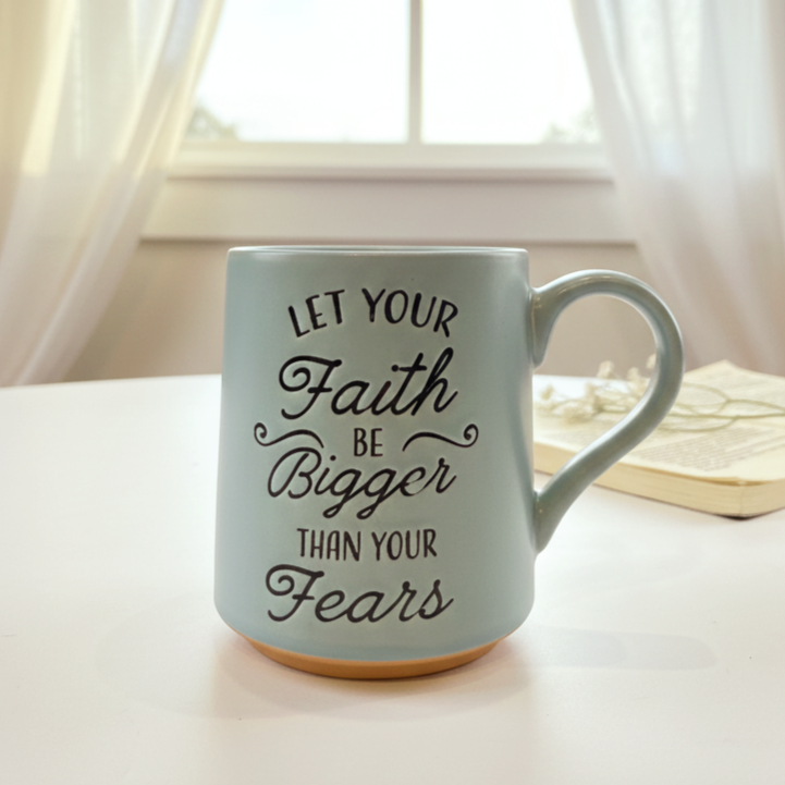 مج بلون مميز ومكتوب عليه عبارة " "اجعل إيمانك أكبر من مخاوفك" حجمه كبير ومناسب لمشروبك المفضل أو هدية مميزة