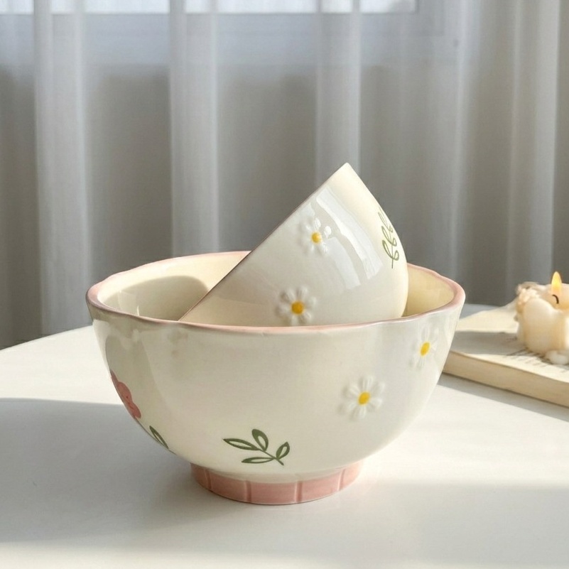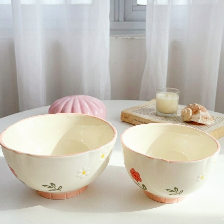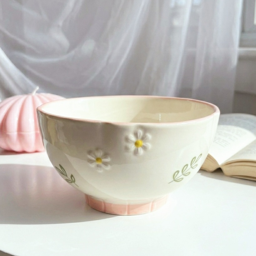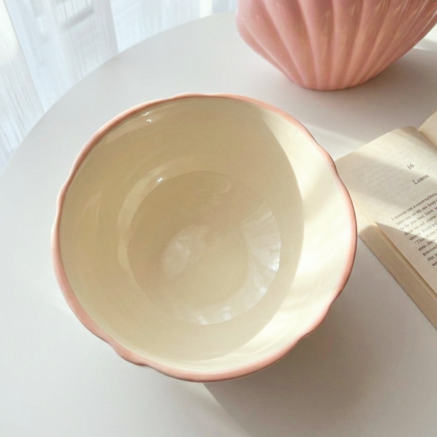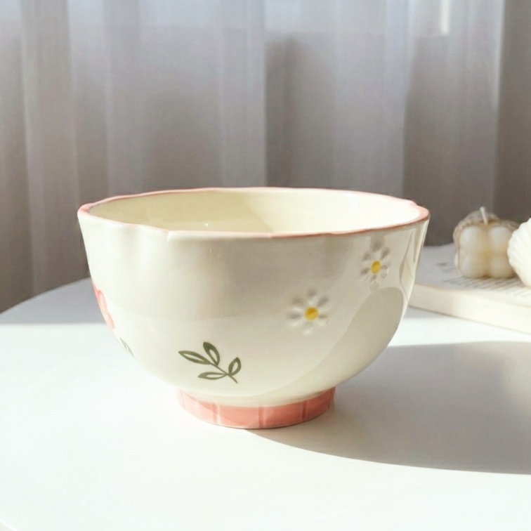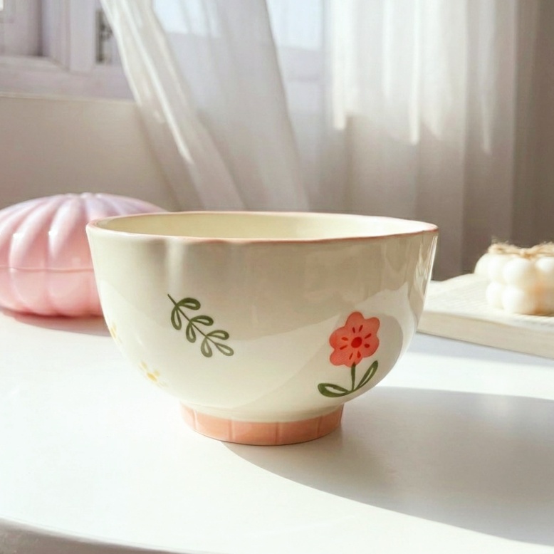 بولة بورسلين بتصميم رقيق يزينه رسومات وورود بألوان هادئة بلون كريمي وبينك وحواف مزخرفة بتضيف لمسة أنيقة