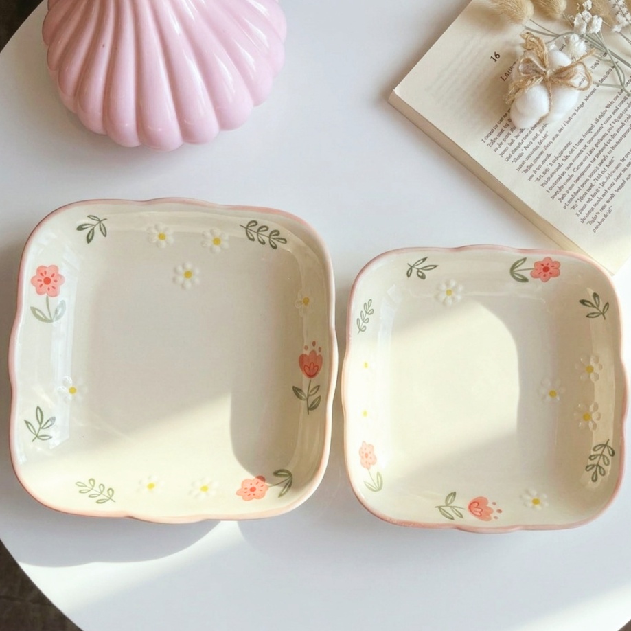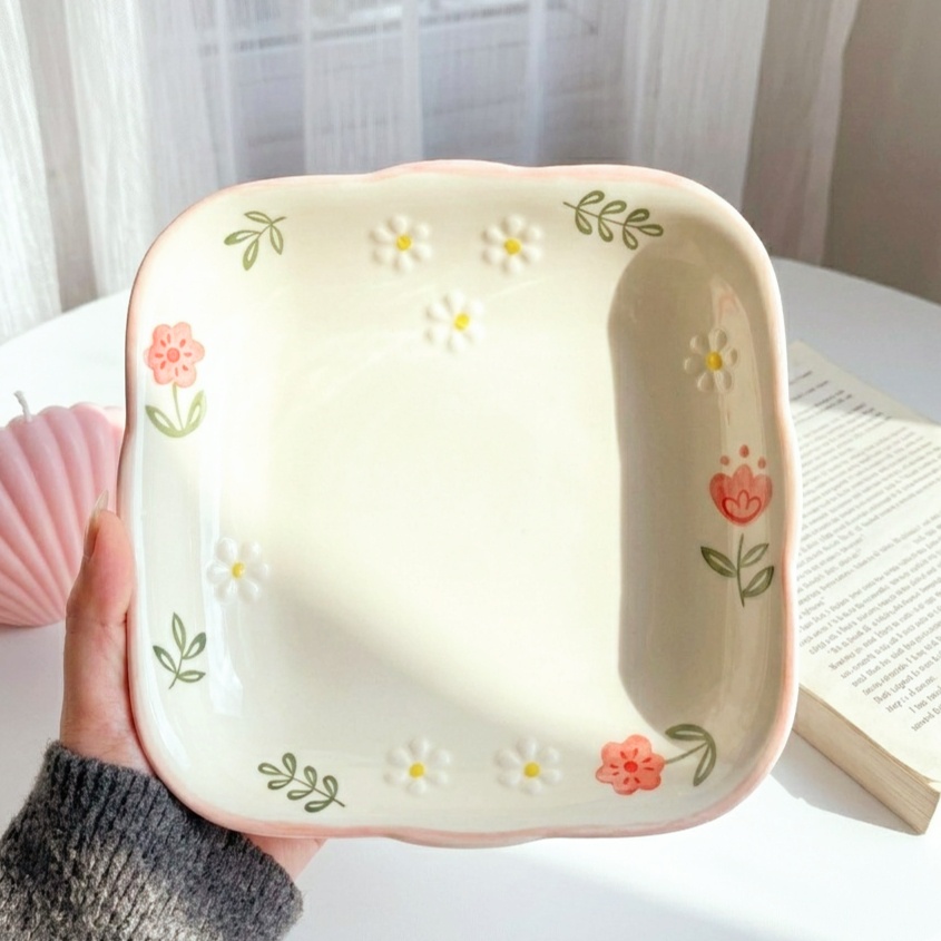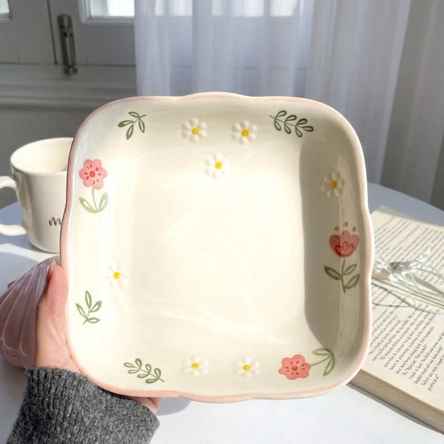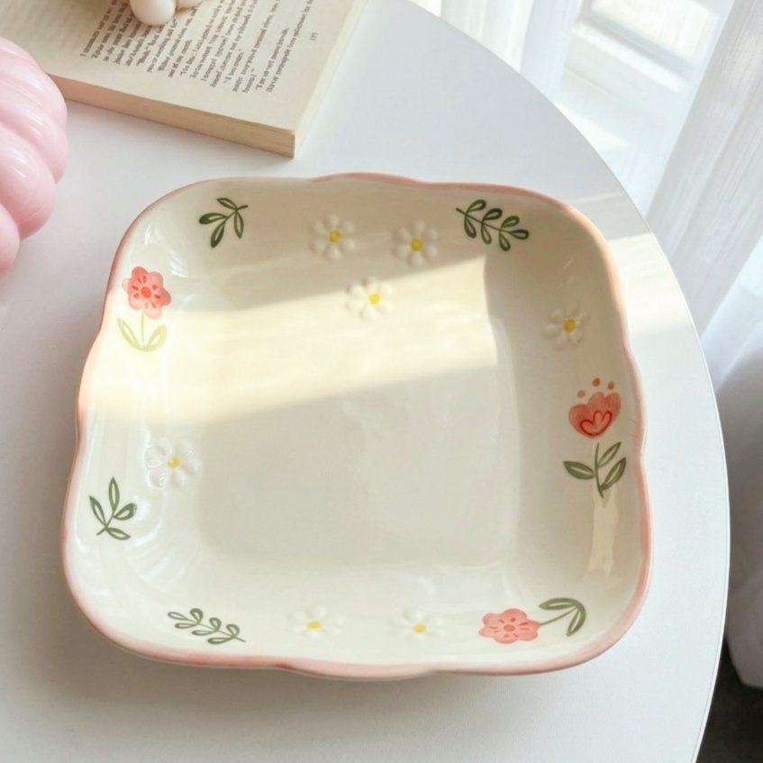 طبق بورسلين بتصميم رقيق يزينه رسومات ورود بألوان هادئة بلون كريمي وبينك وحواف مزخرفة بتضيف لمسة أنيقة