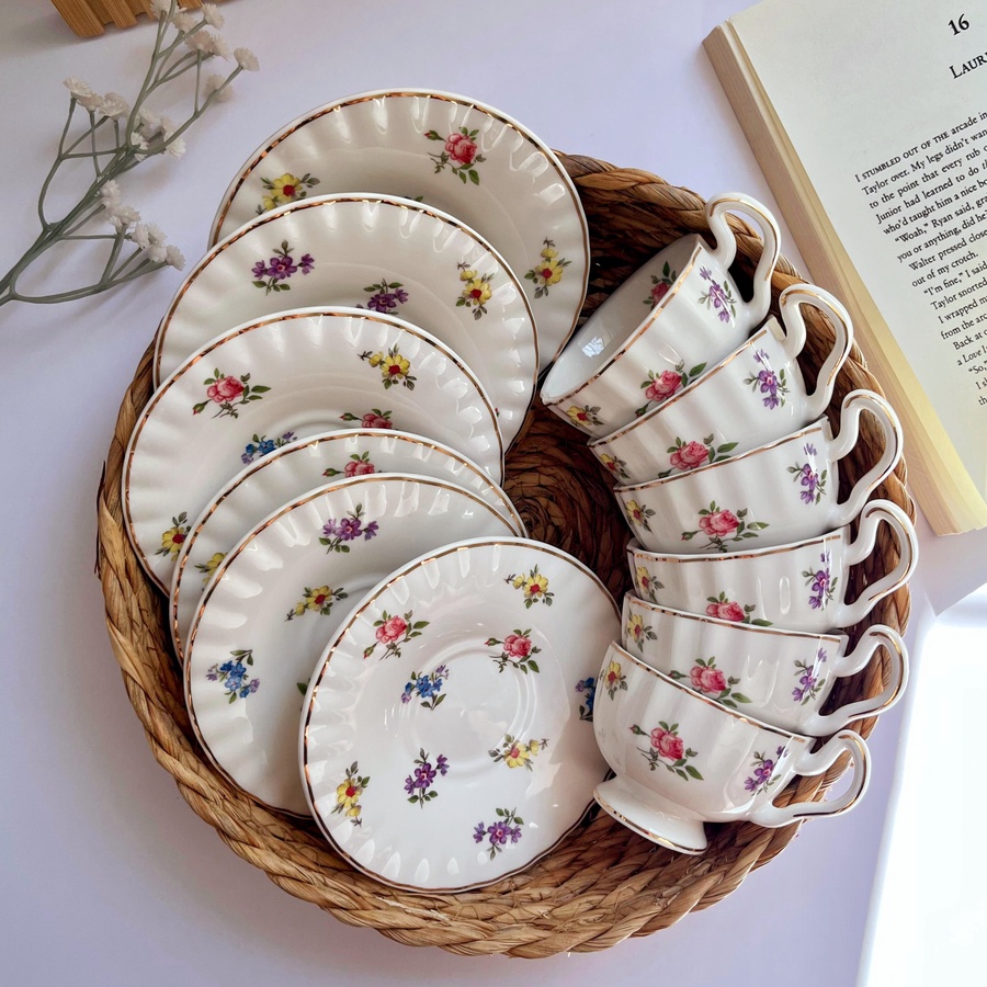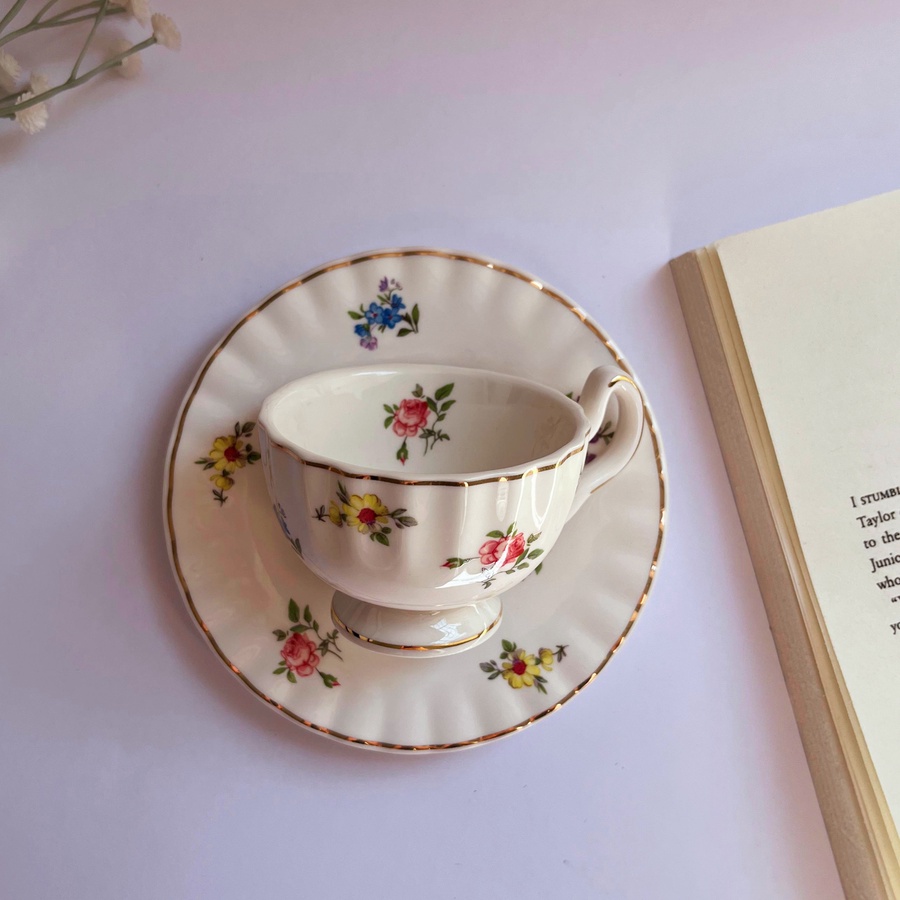 فنجان كلاسيك بلمسة ملكية مزخرف بنقوش زهرية ناعمة وأطراف مذهّبة مثالي لصباح دافئ مصنوع من البورسلين