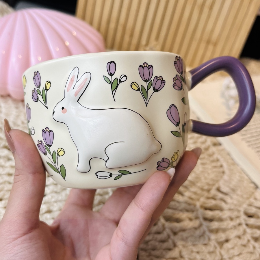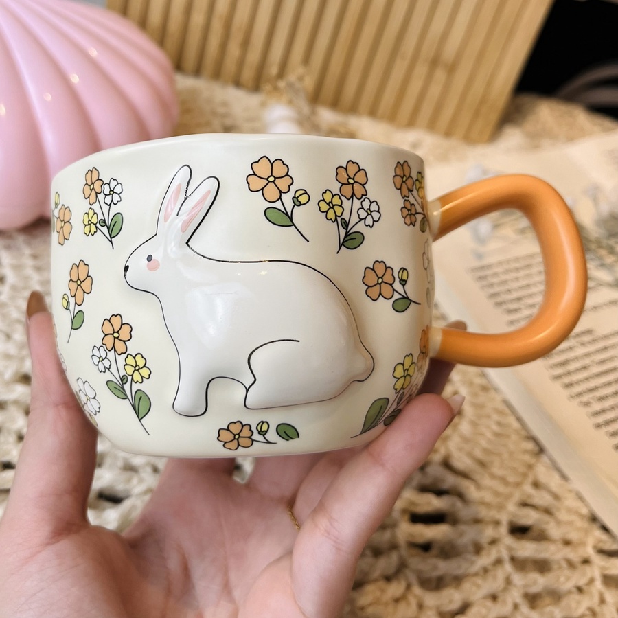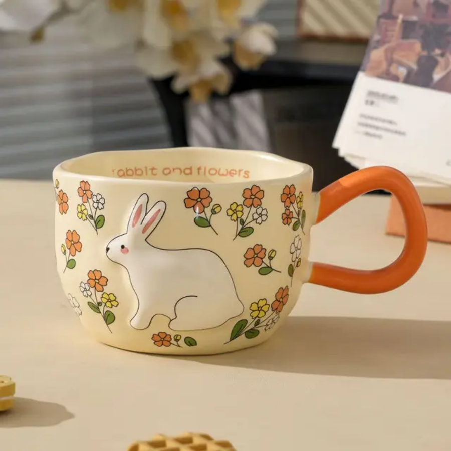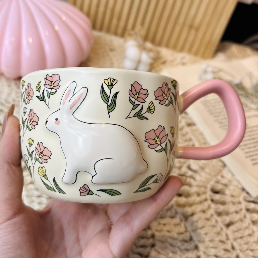 مج كيوت عليه رسمة أرنب بارزة وورود بألوان مبهجة حجمه كبير وهيبقى بداية جميلة ليومك