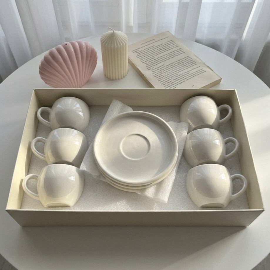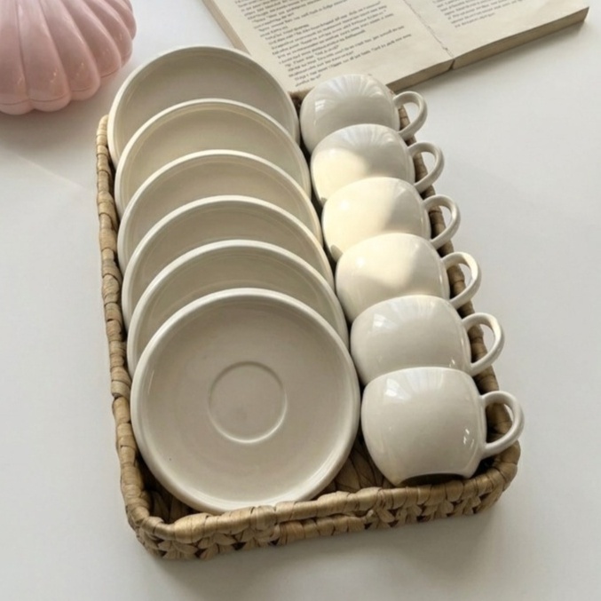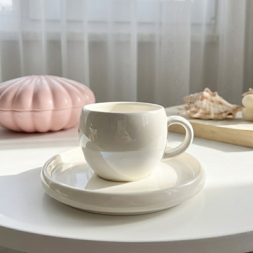 فنجان قهوة بتصميم بسيط وأنيق بلون كريمي لامع يتميز بشكله الدائري الناعم مع طبق متناسق يعطي مظهرًا مرتبًا وكلاسيكيًا مناسب لتقديم الإسبريسو أو القهوة