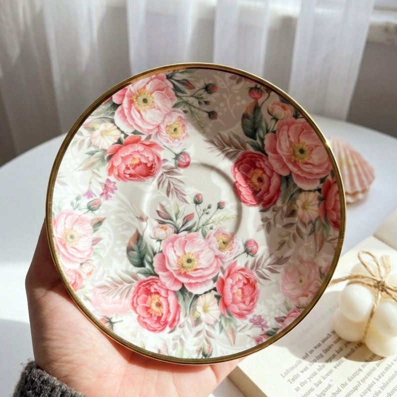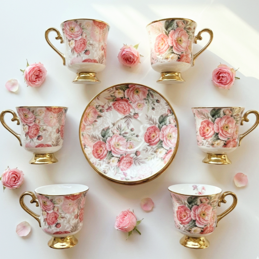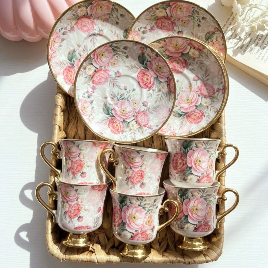 فنجان رقيق جدًا بطابع رومانسي ناعم مزين بورود وردي بدرجات دافئة ومبهجة، مرسومة بتفاصيل واضحة ومليانة حياة كأنها باقة حقيقية ملفوفة حوالين الفنجان