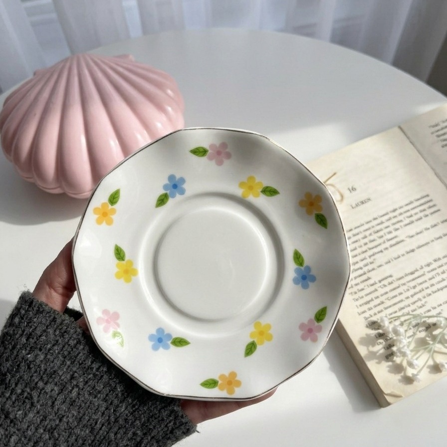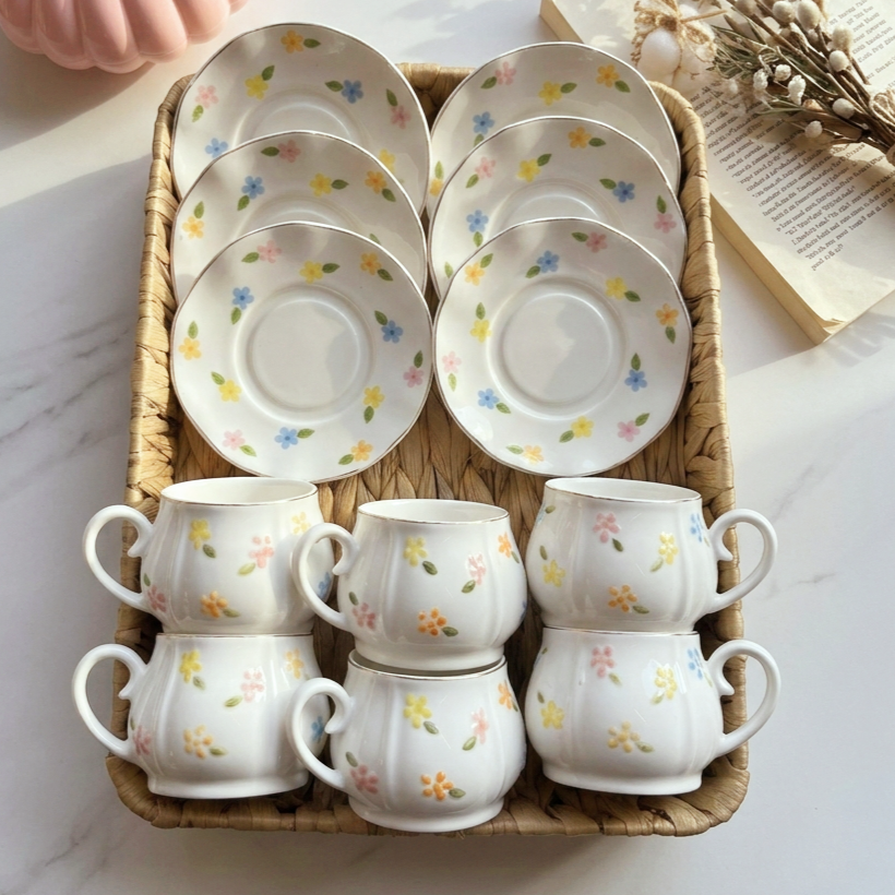 فنجان بورود صغيرة بارزة ملوّنة بدرجات الباستيل الهادية، بيدي إحساس لطيف ومبهج كأنه حديقة صغيرة حوالين الفنجان 💕