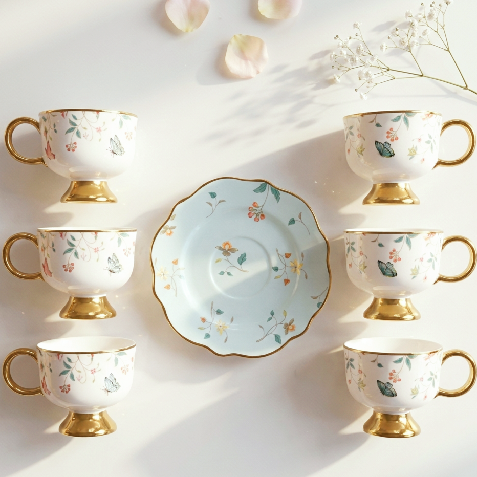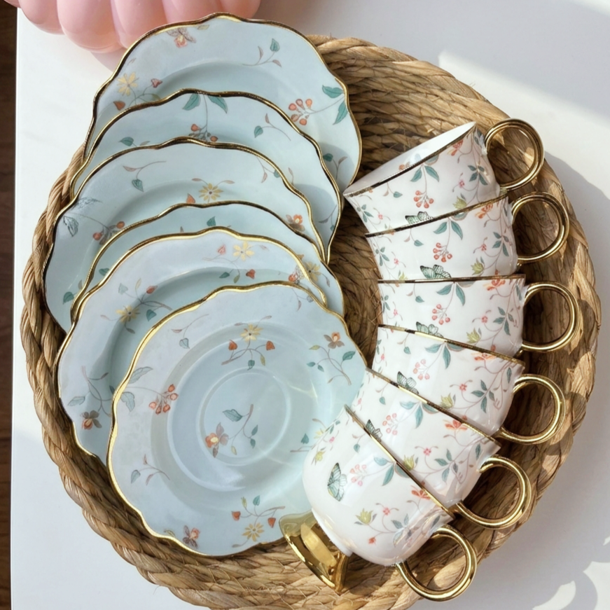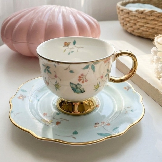 فنجان رقيق مزين بورود ملونة مع رسومات فراشة رقيقة ورسمة ورد صغيرة جوة الفنجان إيده جولد مع قاعدة بنفس اللون ف بتدي إحساس بالفخامة