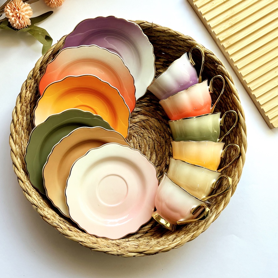 مجموعة goldora بألوان كلها بهجة ونعومة كل فنجان بلون ومدرج كإنه لوحة فنية شكل الفنجان مميز وبإطار دهبي عشان يزود أناقته وجماله