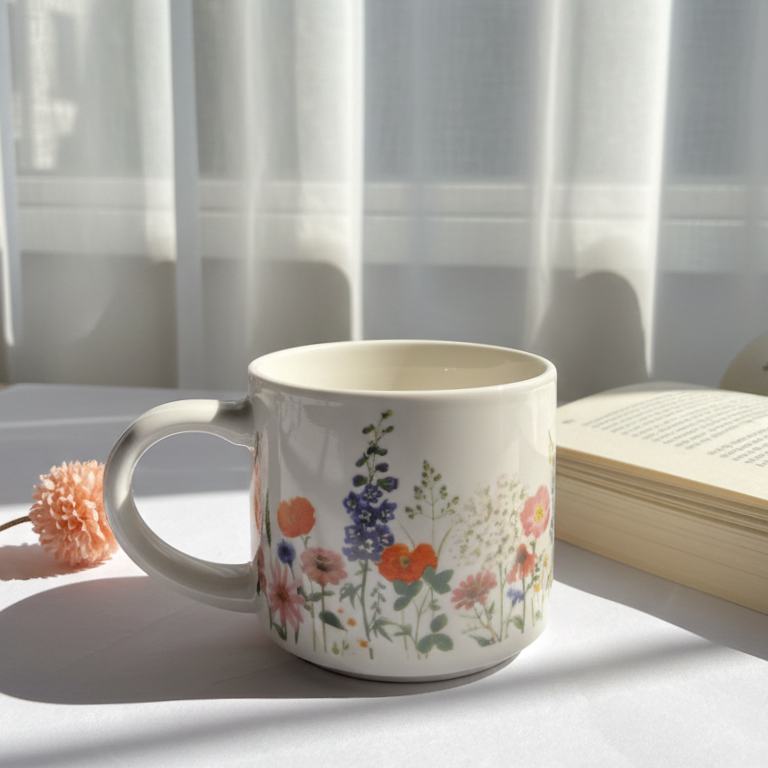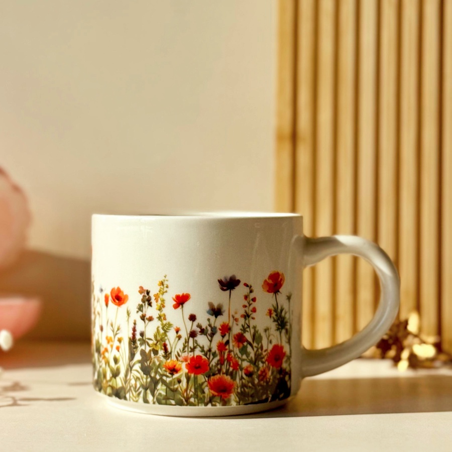 مج بورسلين عليه رسومات ورد بألوان مختلفة حجم مثالي وشكل لطيف لبداية اليوم