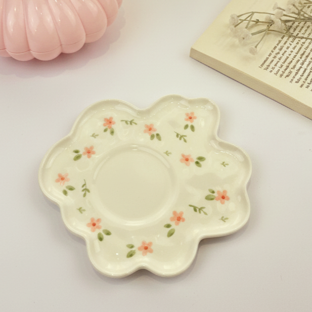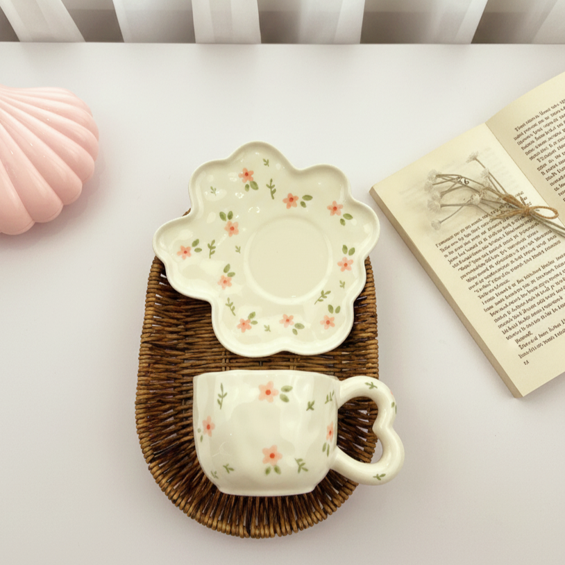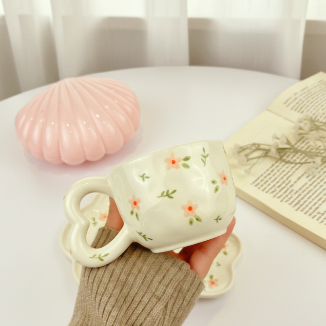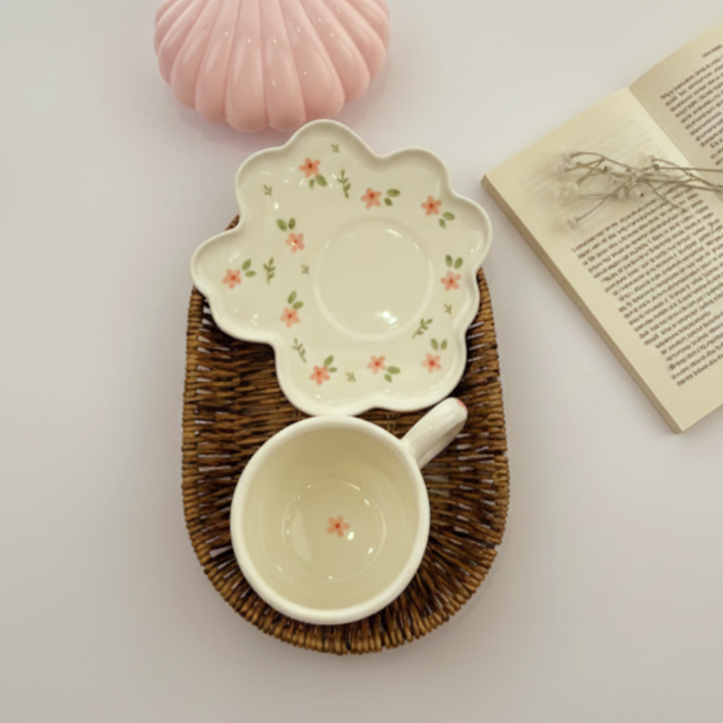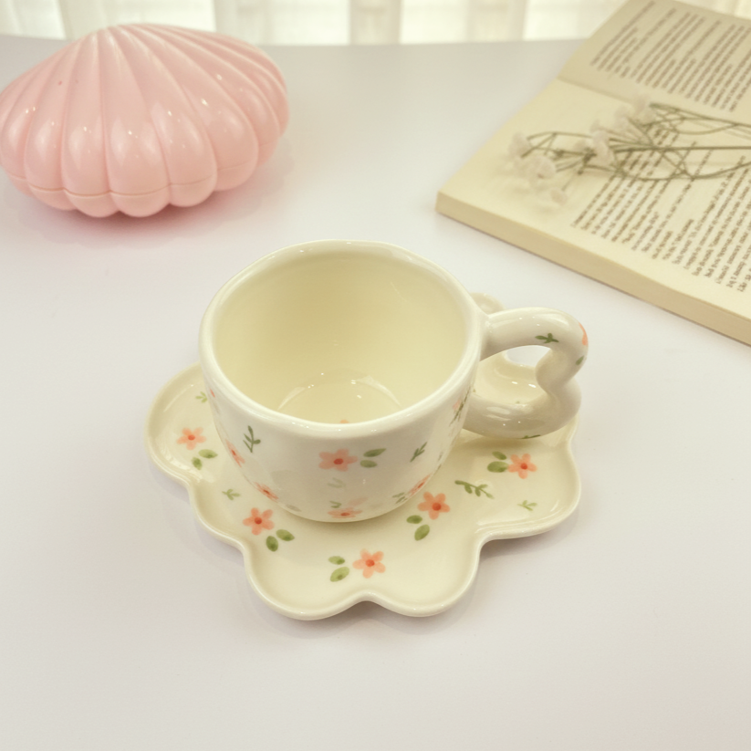 مج لطيف بالطبق مرسوم عليه ورود صغيرة باللون البينك مناسب لمشروبك المفضل ويمكن استخدام الطبق ك كوستر