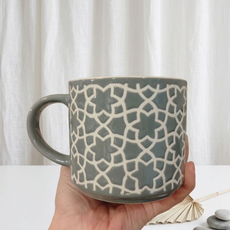 مج بلون رصاصي وأبيض عليه زخارف مميزة شكله كلاسيك وأنيق