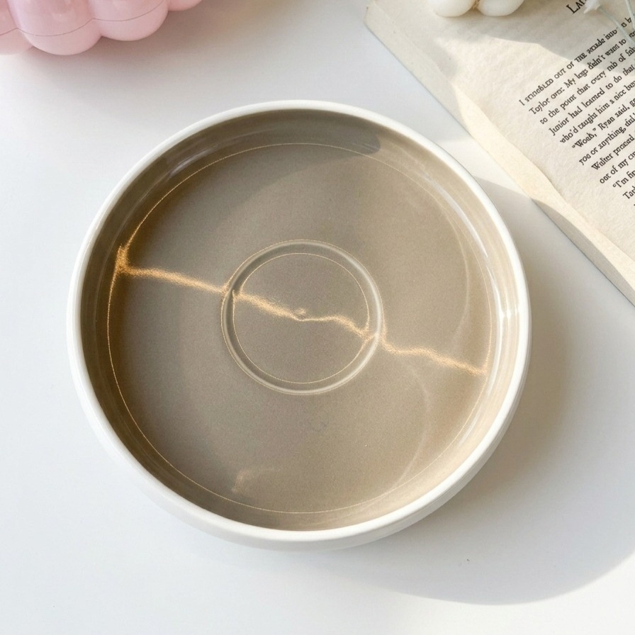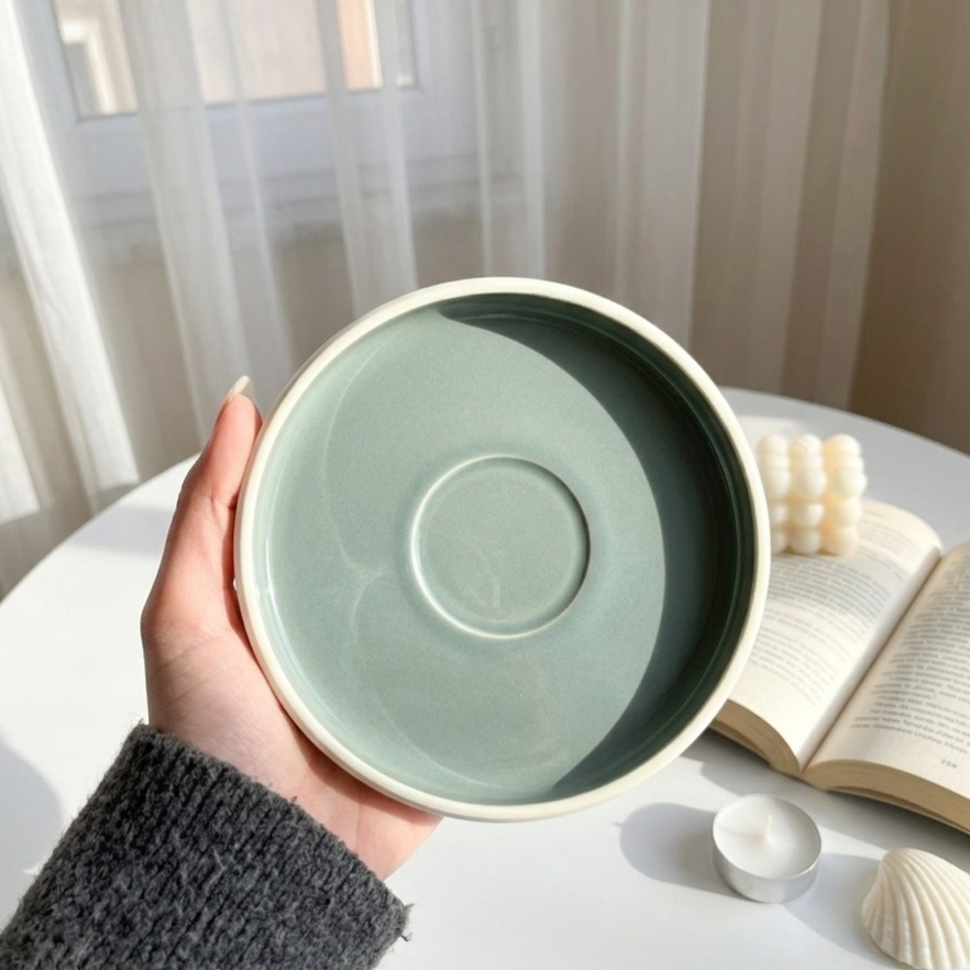 الفنجان بلون أبيض وملون من جوة بنفس لون الطبق