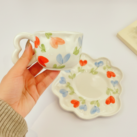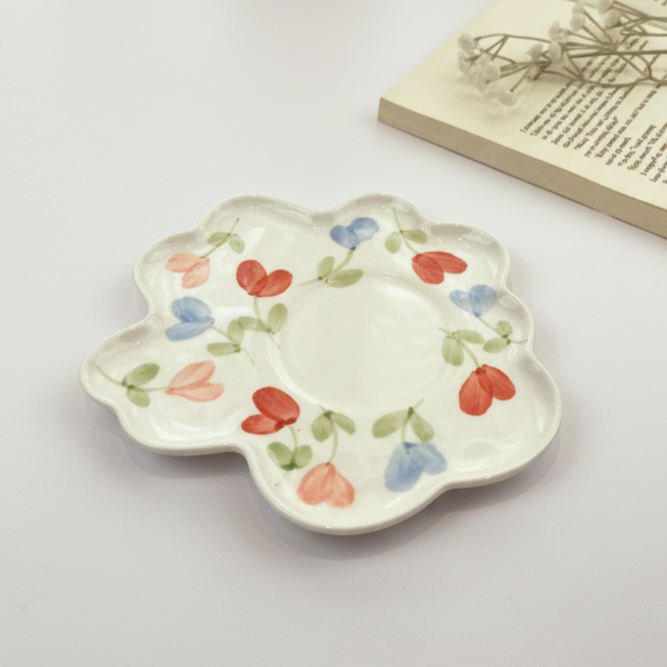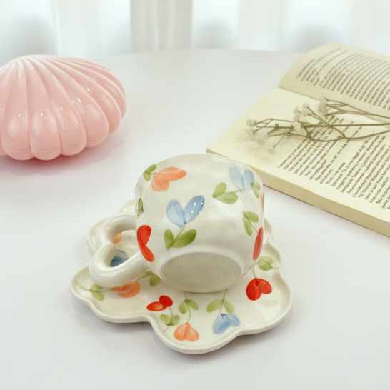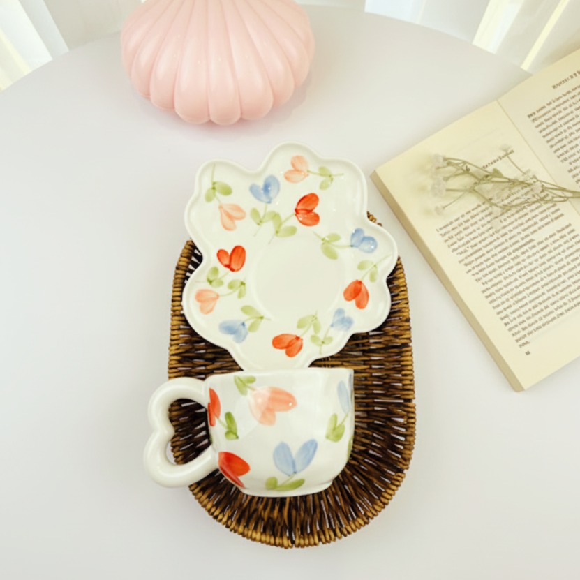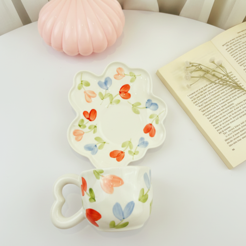 مج لطيف بالطبق مرسوم عليه ورق شجر على شكل قلب بألوان مبهجة وجميلة مناسب لمشروبك المفضل ويمكن استخدام الطبق ك كوستر