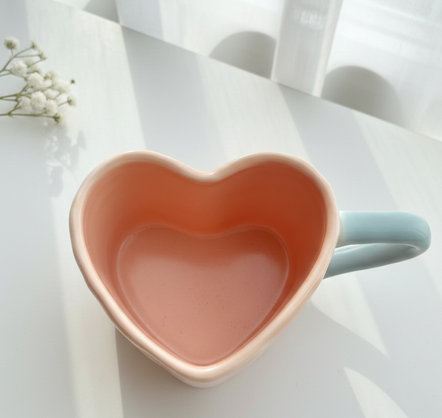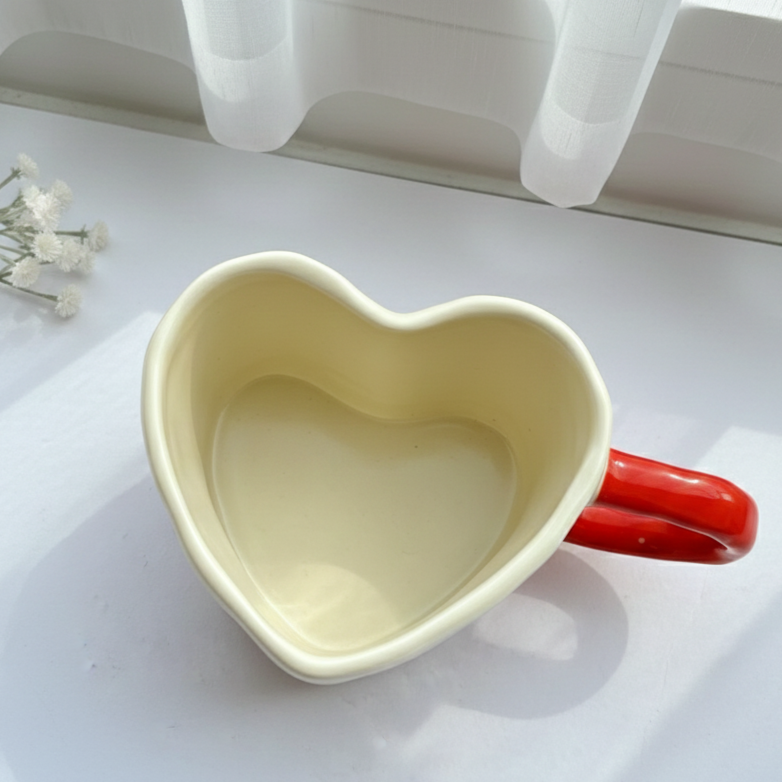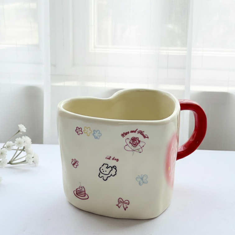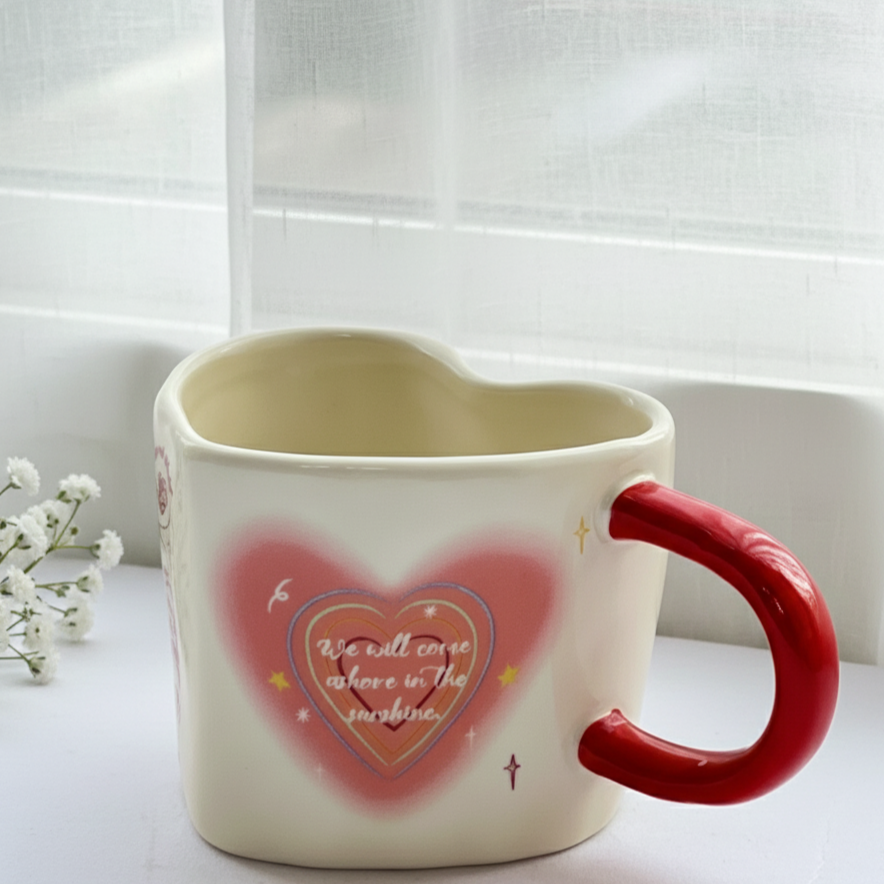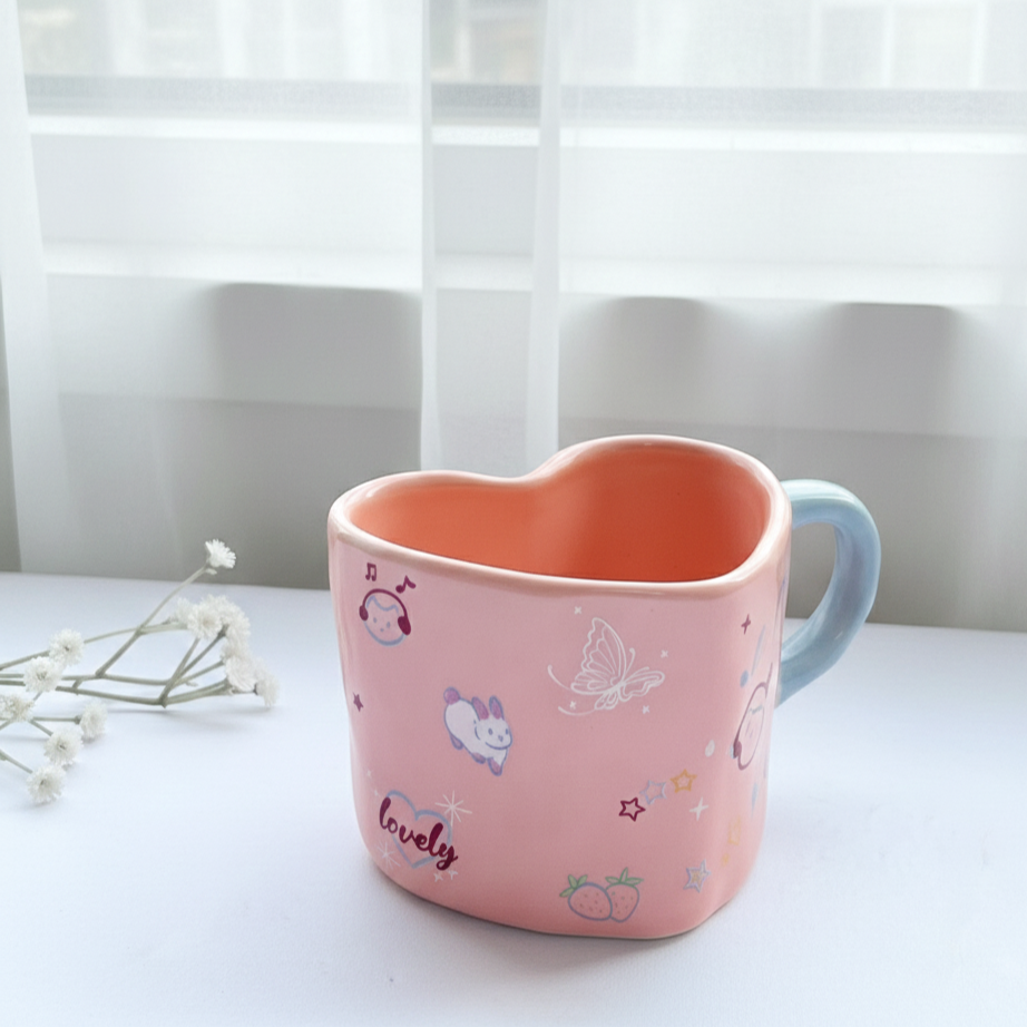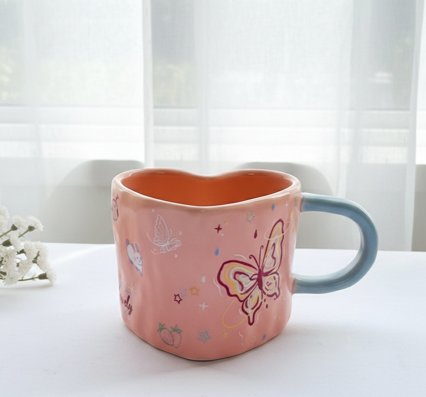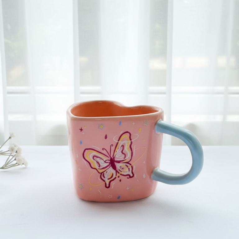 مج على شكل قلب ورسومات فراشة بلونين بينك*لبني وأوف وايت*أحمر شكله مميز وهدية لطيفة تعبر عن حبك