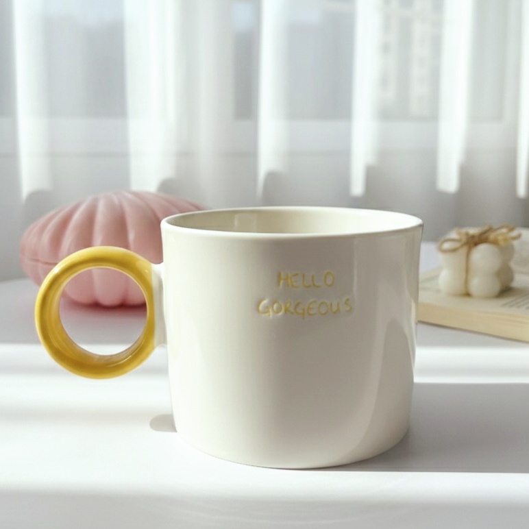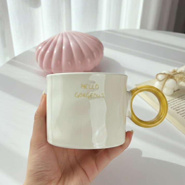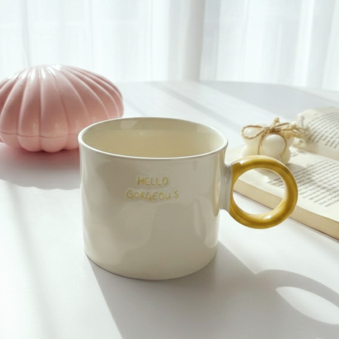 مج لامع بيد مدورة مميزة مكتوب عليه Hello Gorgeous عشان يبقى هدية مميزة