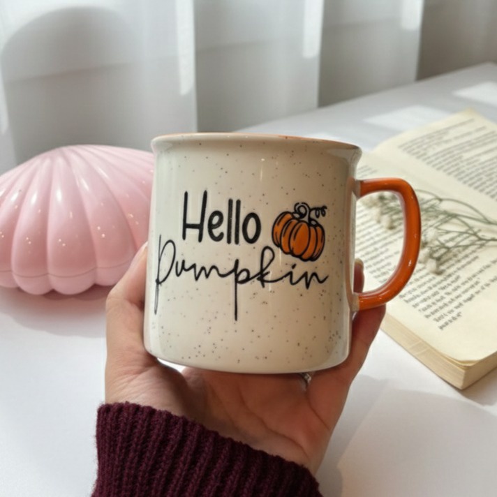 مج منقط ومكتوب عليه hello pumpkin بشكل مميز