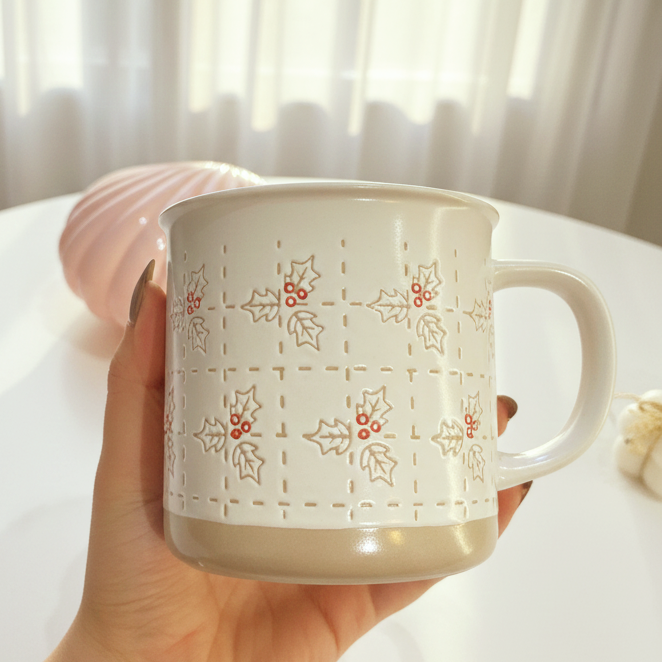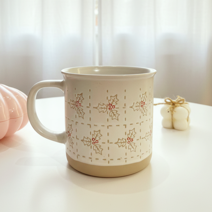 مج عليه رسمة نبات ال holly مع حبات توت حمراء بيرمز للشتا والدفء شكله كلاسيك وناعم