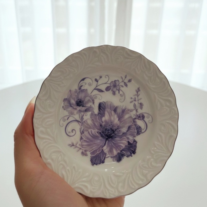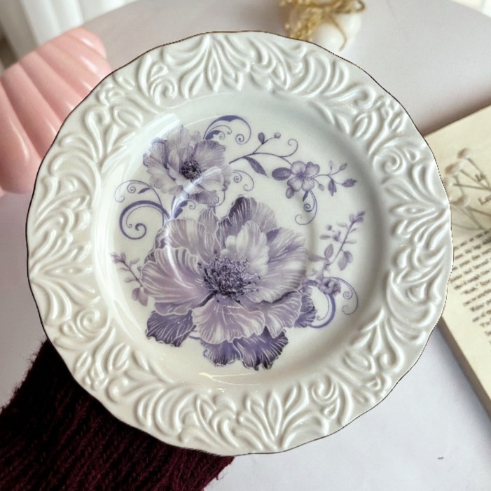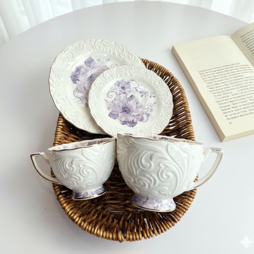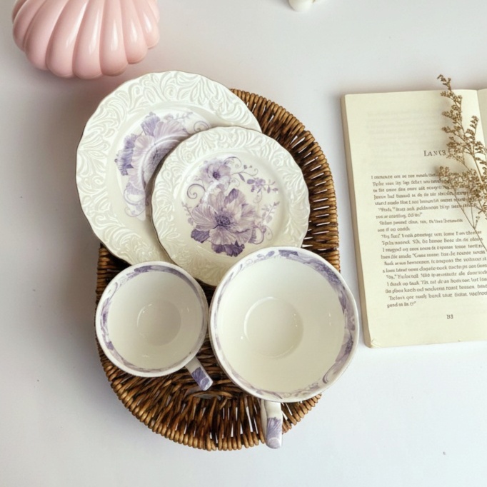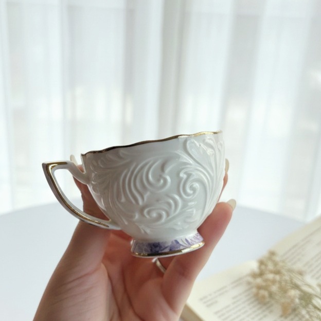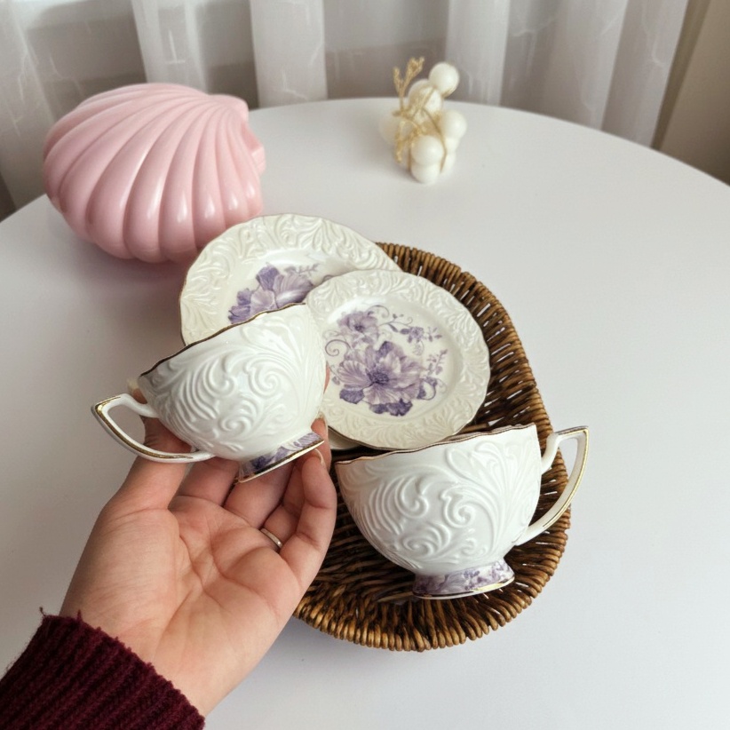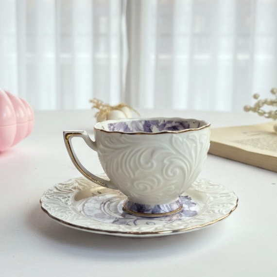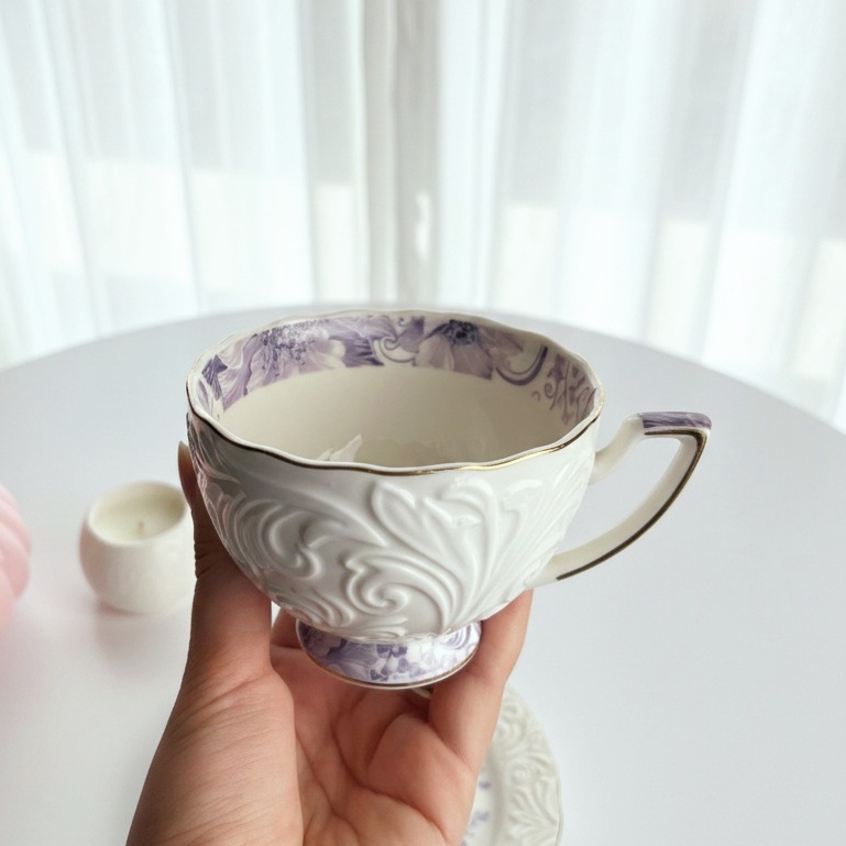 فنجان أنيق عليه رسومات بارزة باللون الأبيض وورد باللون الموڤ هيبقى بداية رايقة ليومك