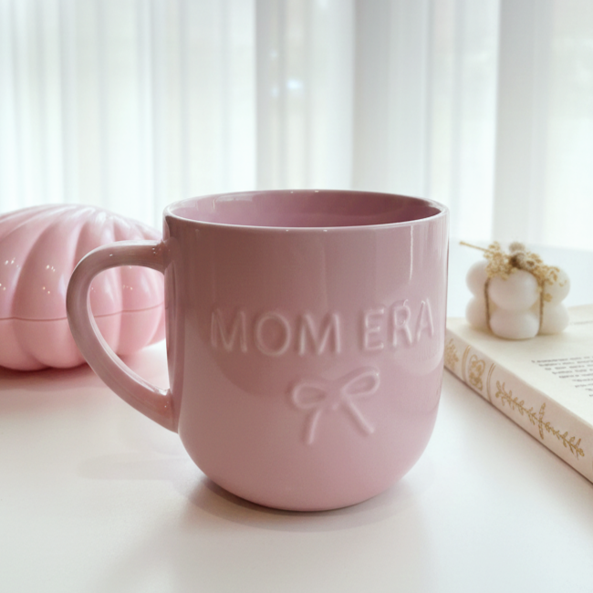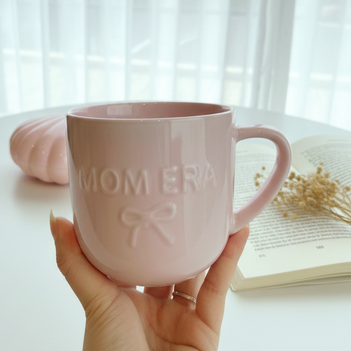 مج بلون بينك وعليه رسمة فيونكة لطيفة مكتوب عليه mom era ومعناها مرحلة الأمومة