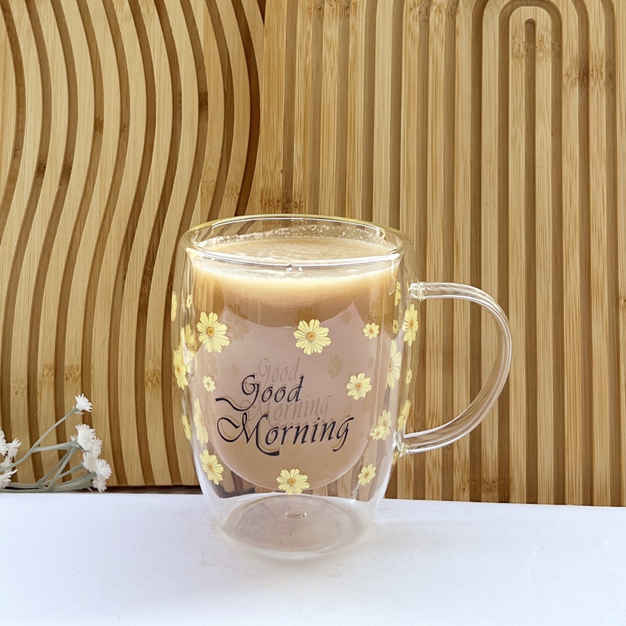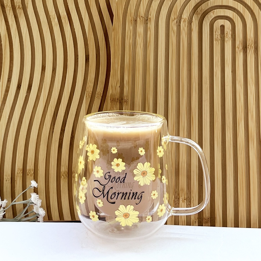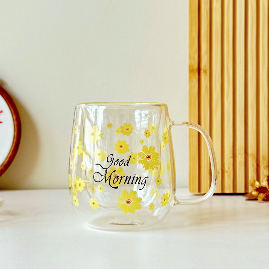 مج دبل جلاس مكتوب عليه goodmorning ورسومات ورد أصفر هيبقى بداية مشرقة ليومك