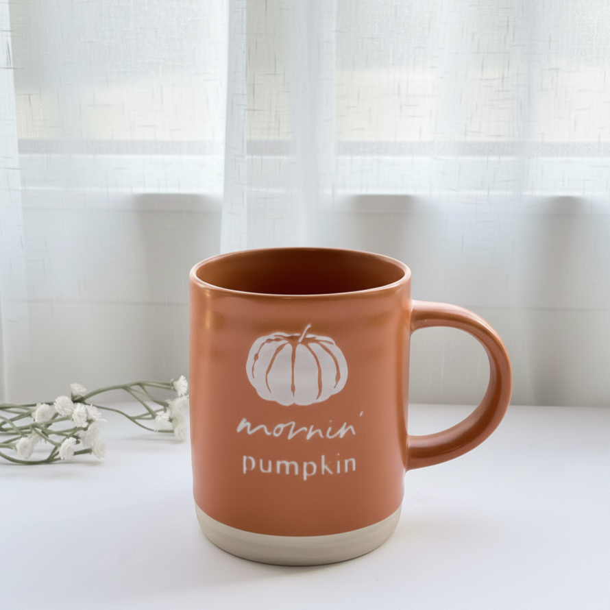 مج خريفي بلون مميز وحجم كبير مكتوب عليه جملة morning pumpkin