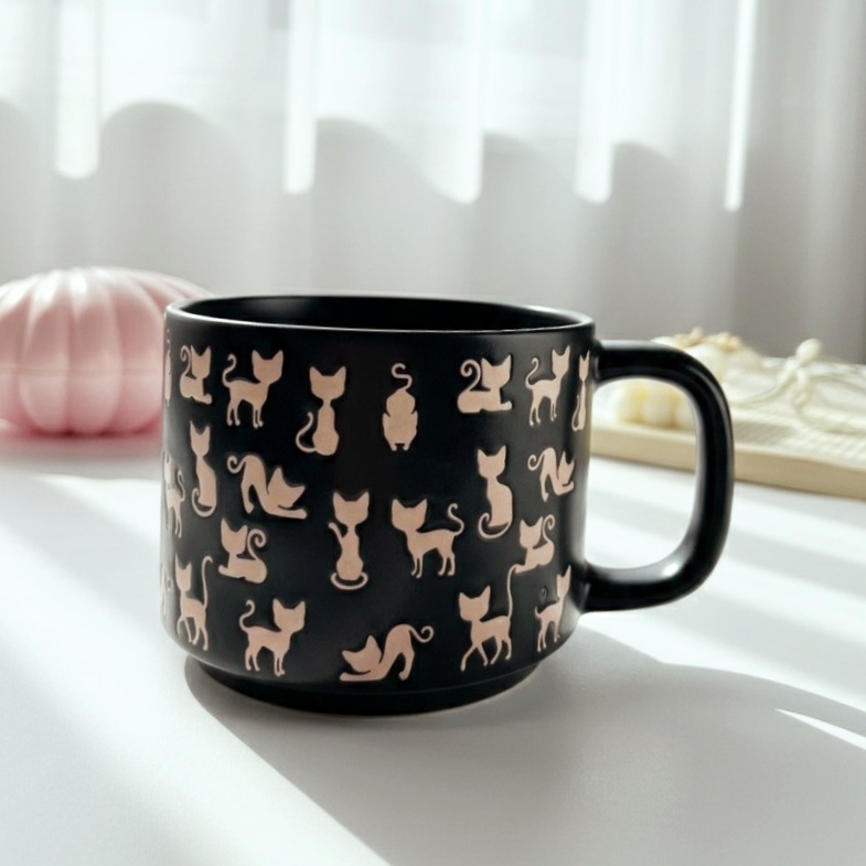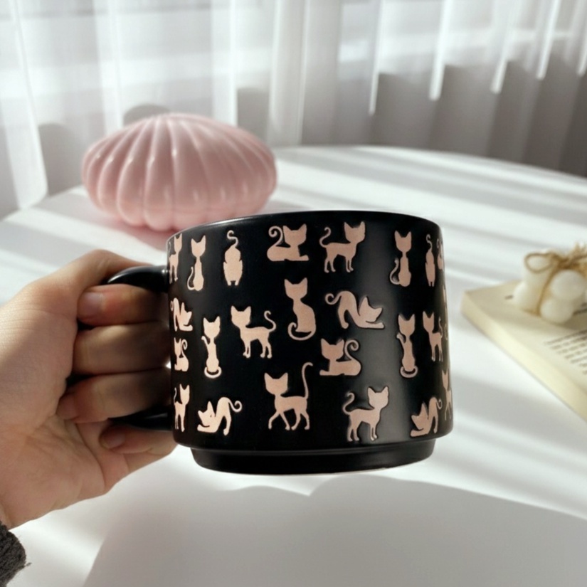 مج أنيق باللون الأسود مزيّن برسومات قطط باللون البينك ممتدة بطول المج اللون الأسود يمنح إحساسًا عصريًا وراقيًا، بينما تضيف القطط الوردية لمسة مرحة وأنثوية