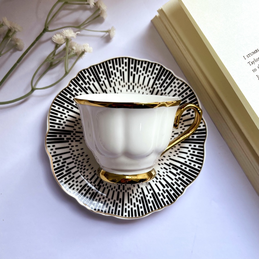 فنجان يجمع بين الأناقة الكلاسيكية واللمسة العصرية تصميمه بخطوط سوداء راقية تحيط بالطبق كأشعة فخمة، وتفاصيله الذهبية تضيف لمسة من الفخامة والأناقة