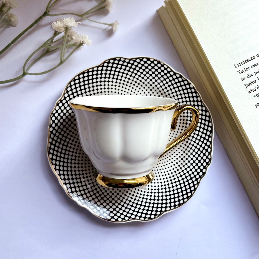 فنجان يجمع بين الأناقة الكلاسيكية واللمسة العصرية تصميمه بخطوط سوداء راقية تحيط بالطبق كأشعة فخمة، وتفاصيله الذهبية تضيف لمسة من الفخامة والأناقة